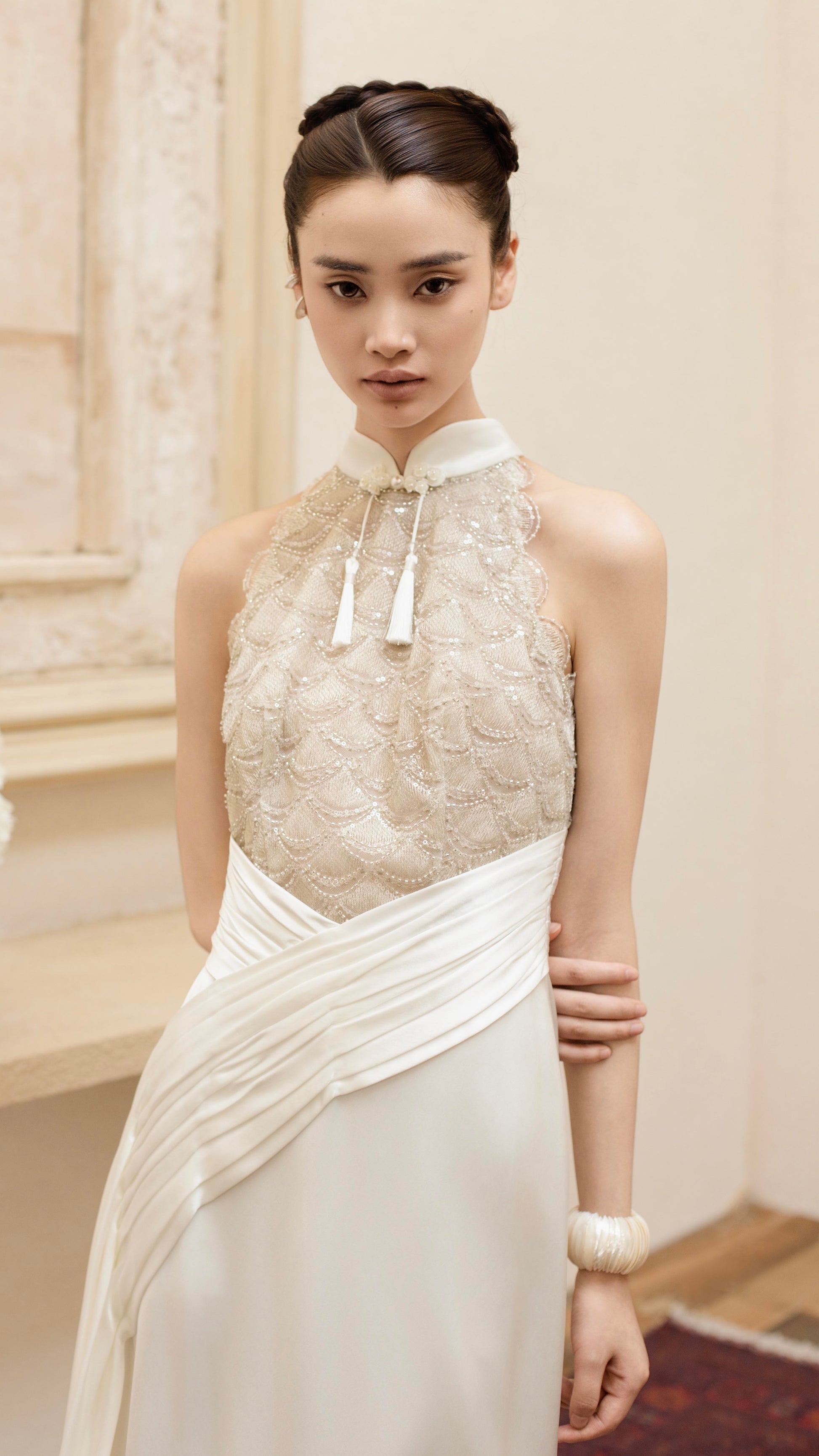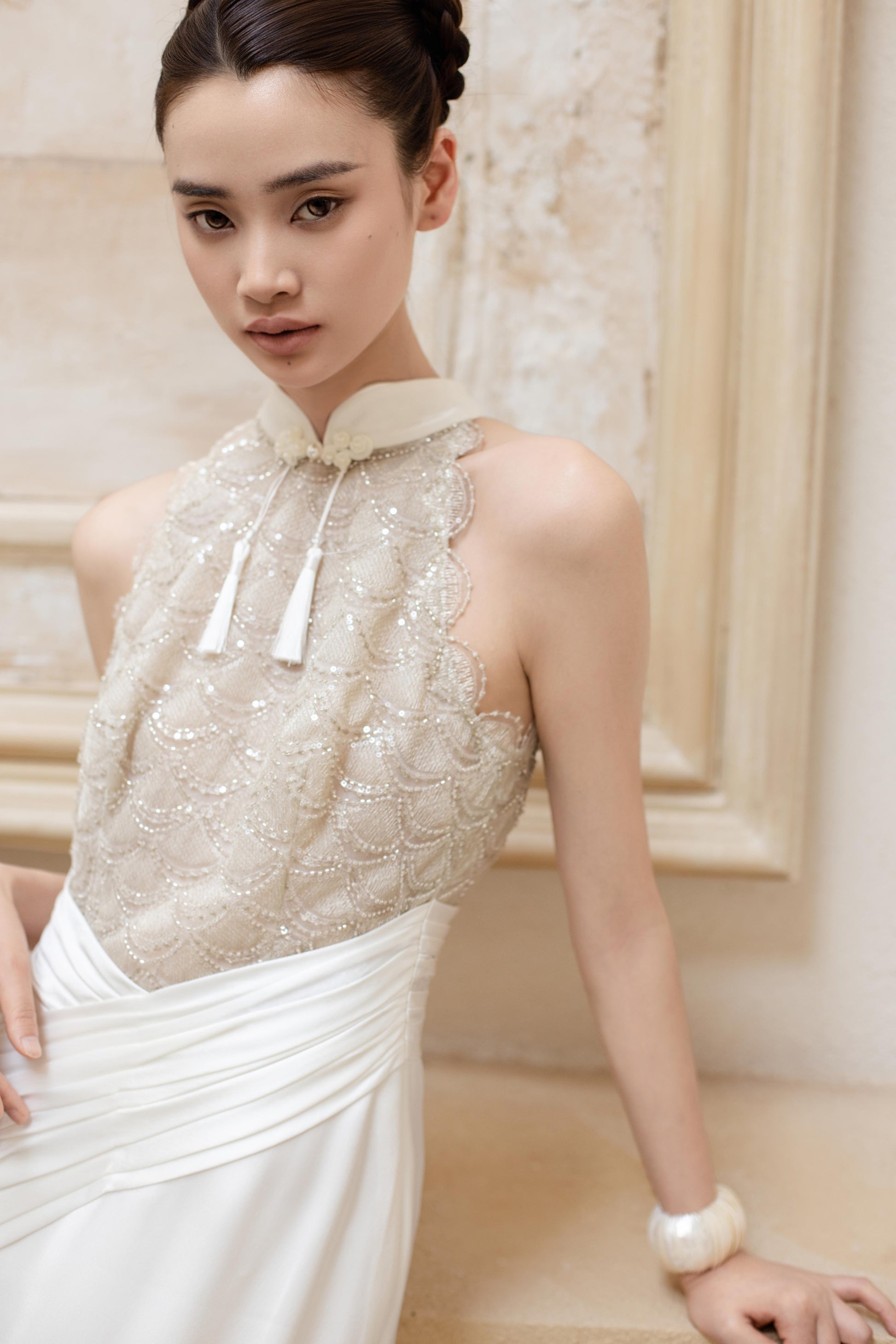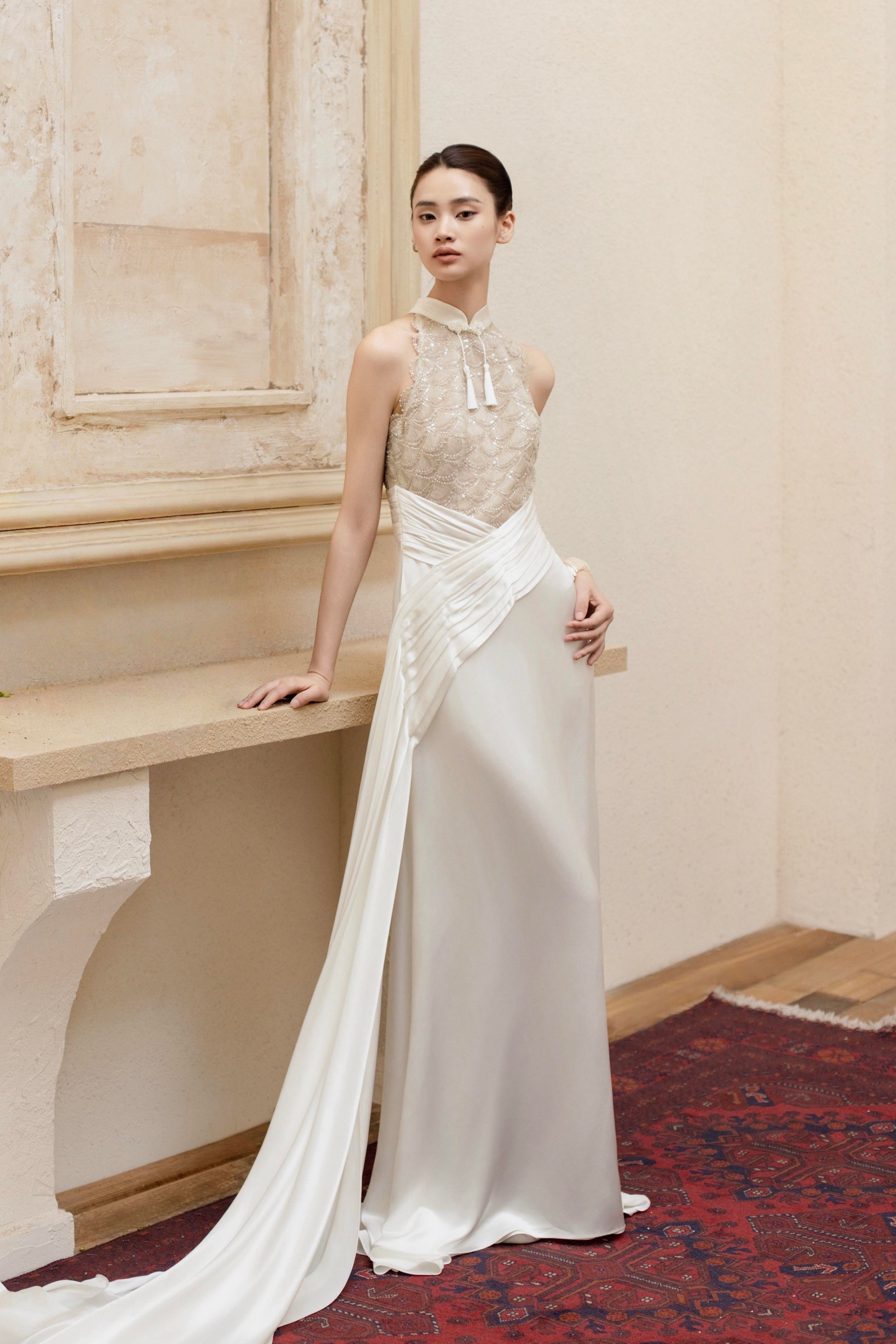 版型设计:整体为分体式设计,层次丰富又不失轻盈抹胸包臀短裙,裙摆线条利落。向上弧度的抹胸,借鉴了中国传统服饰儒裙,中式美学的优雅。下裙内搭为天丝抽褶裙,若隐若现的下摆虚实交融之间,平衡了力量与灵气。面料使用:法国进口光泽缎,哑光自然。