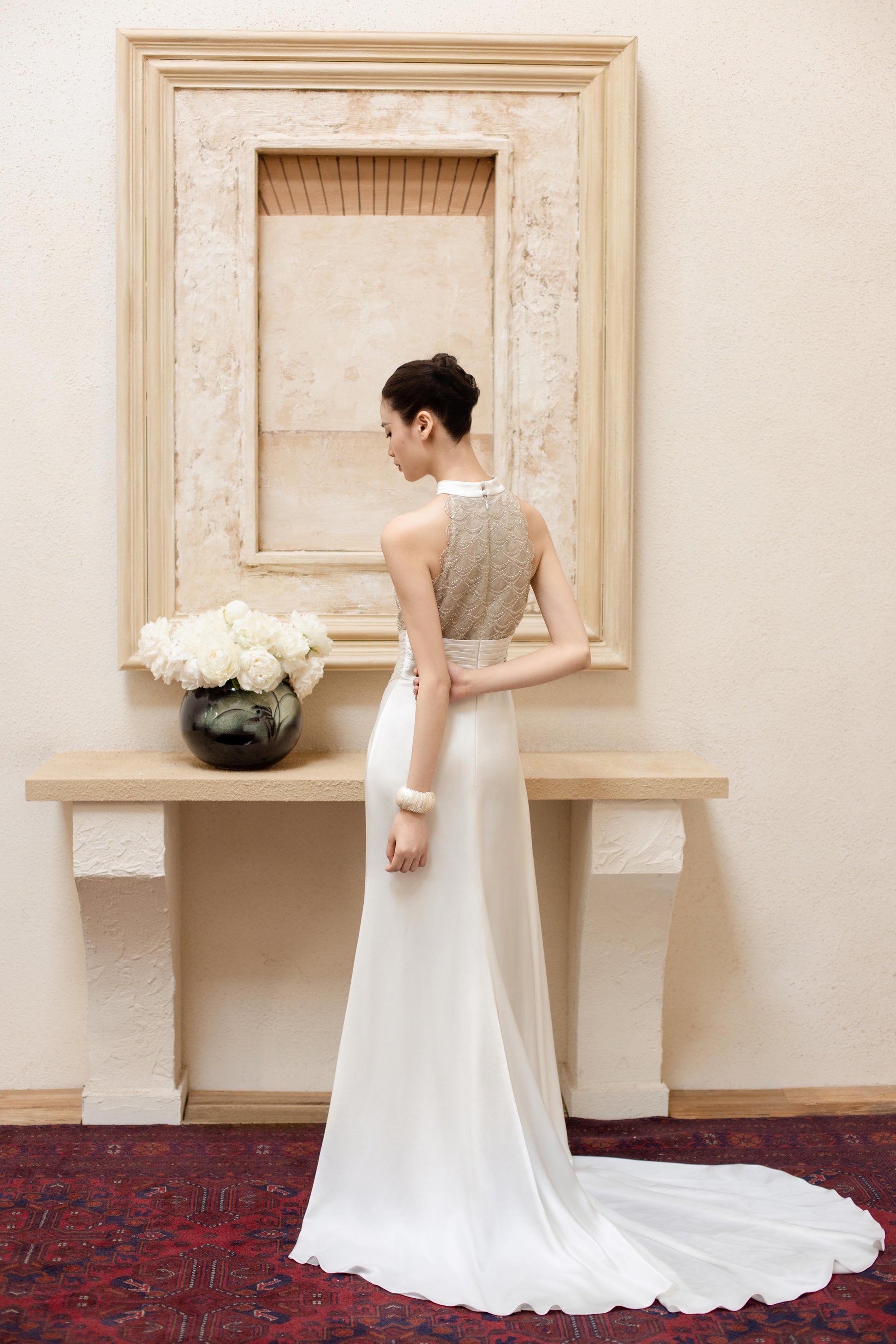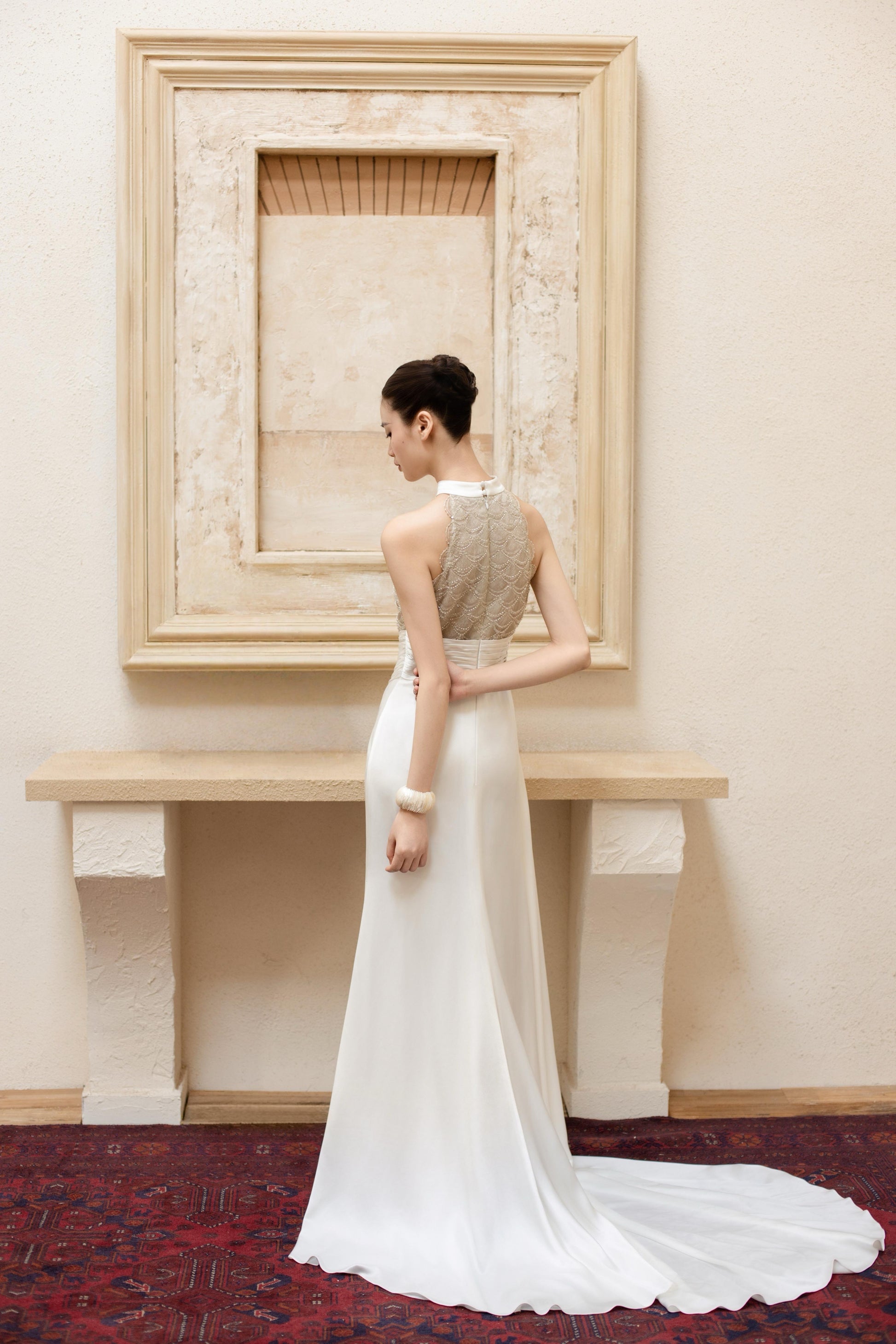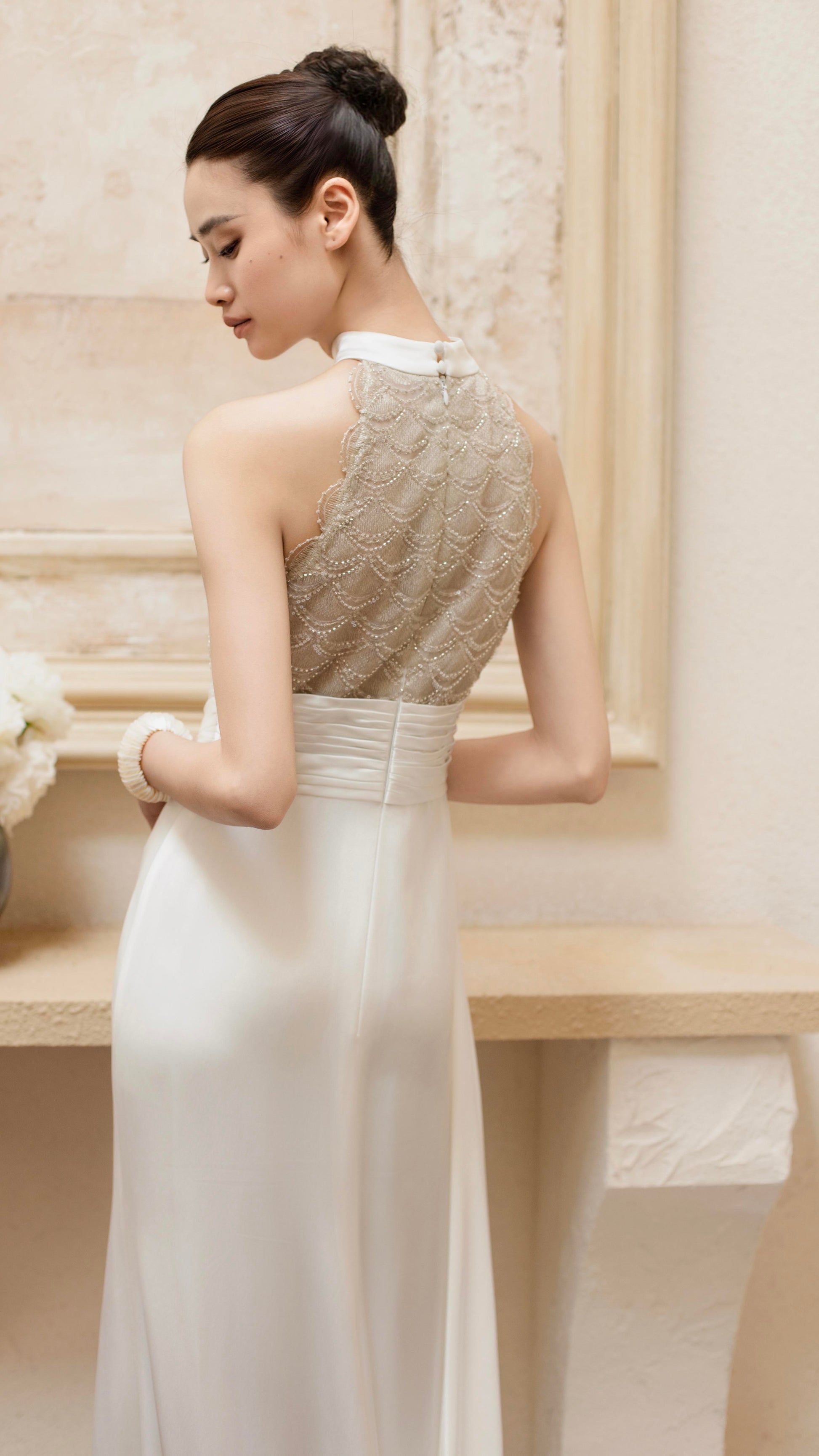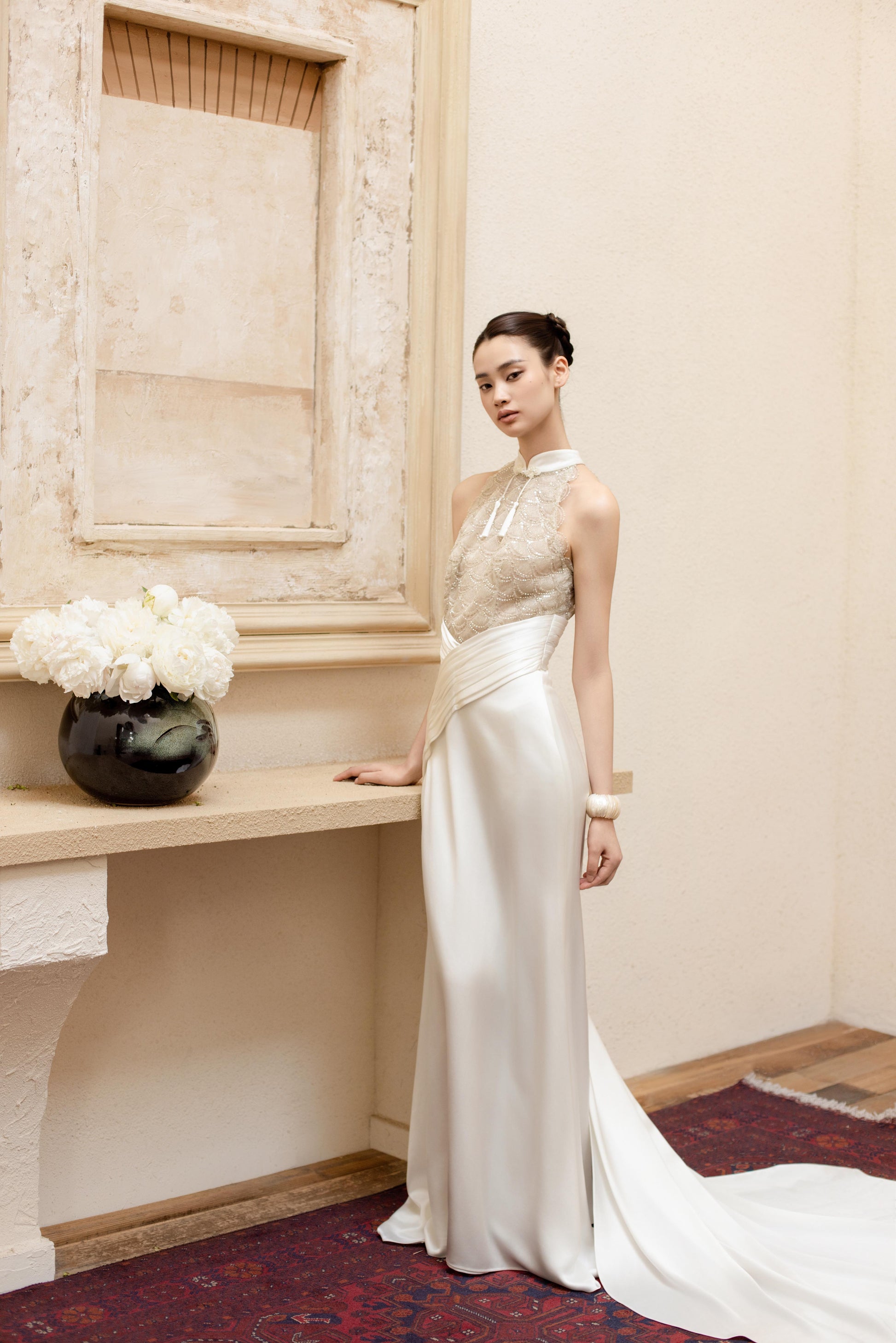 版型设计:整体为分体式设计,层次丰富又不失轻盈抹胸包臀短裙,裙摆线条利落。向上弧度的抹胸,借鉴了中国传统服饰儒裙,中式美学的优雅。下裙内搭为天丝抽褶裙,若隐若现的下摆虚实交融之间,平衡了力量与灵气。面料使用:法国进口光泽缎,哑光自然。