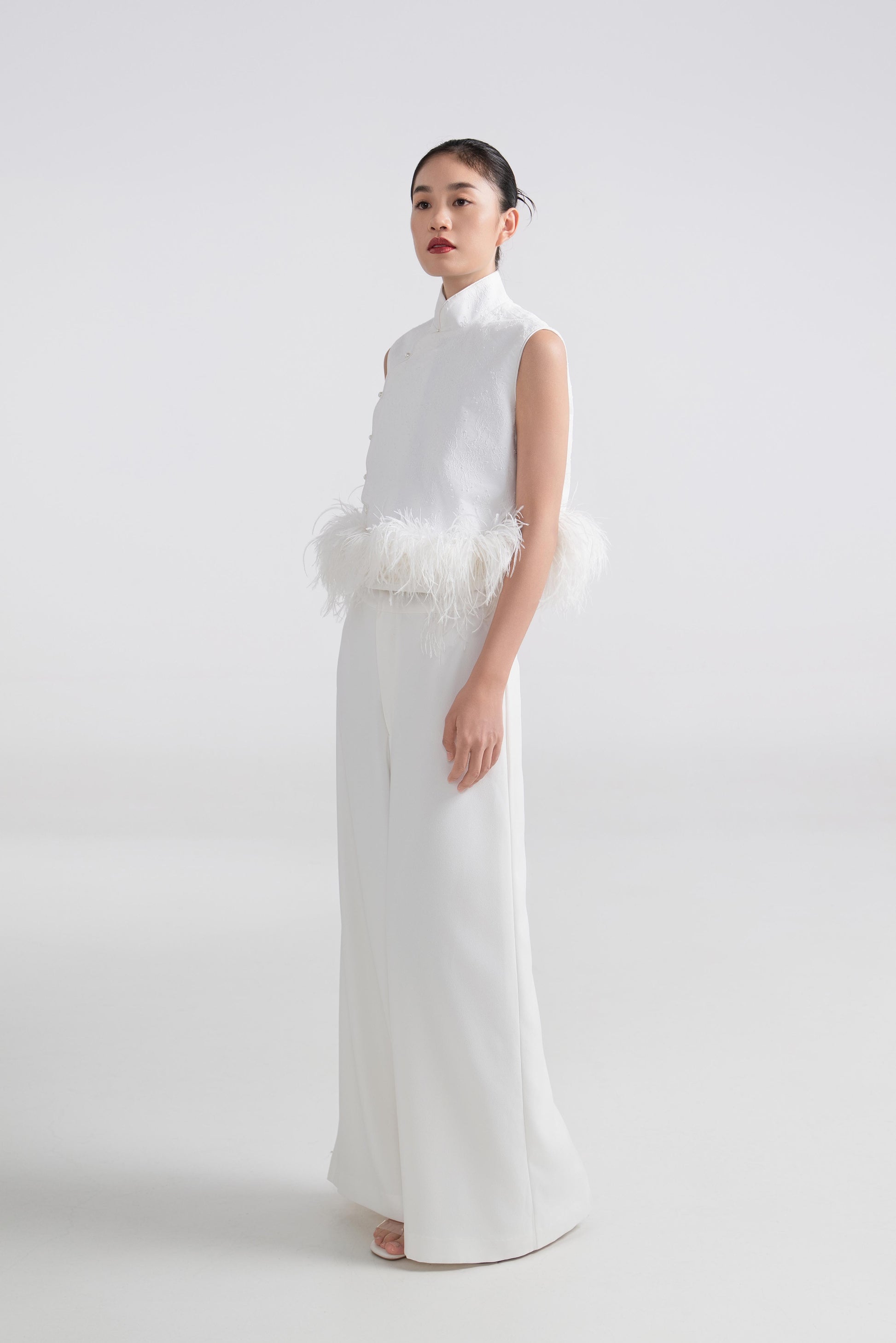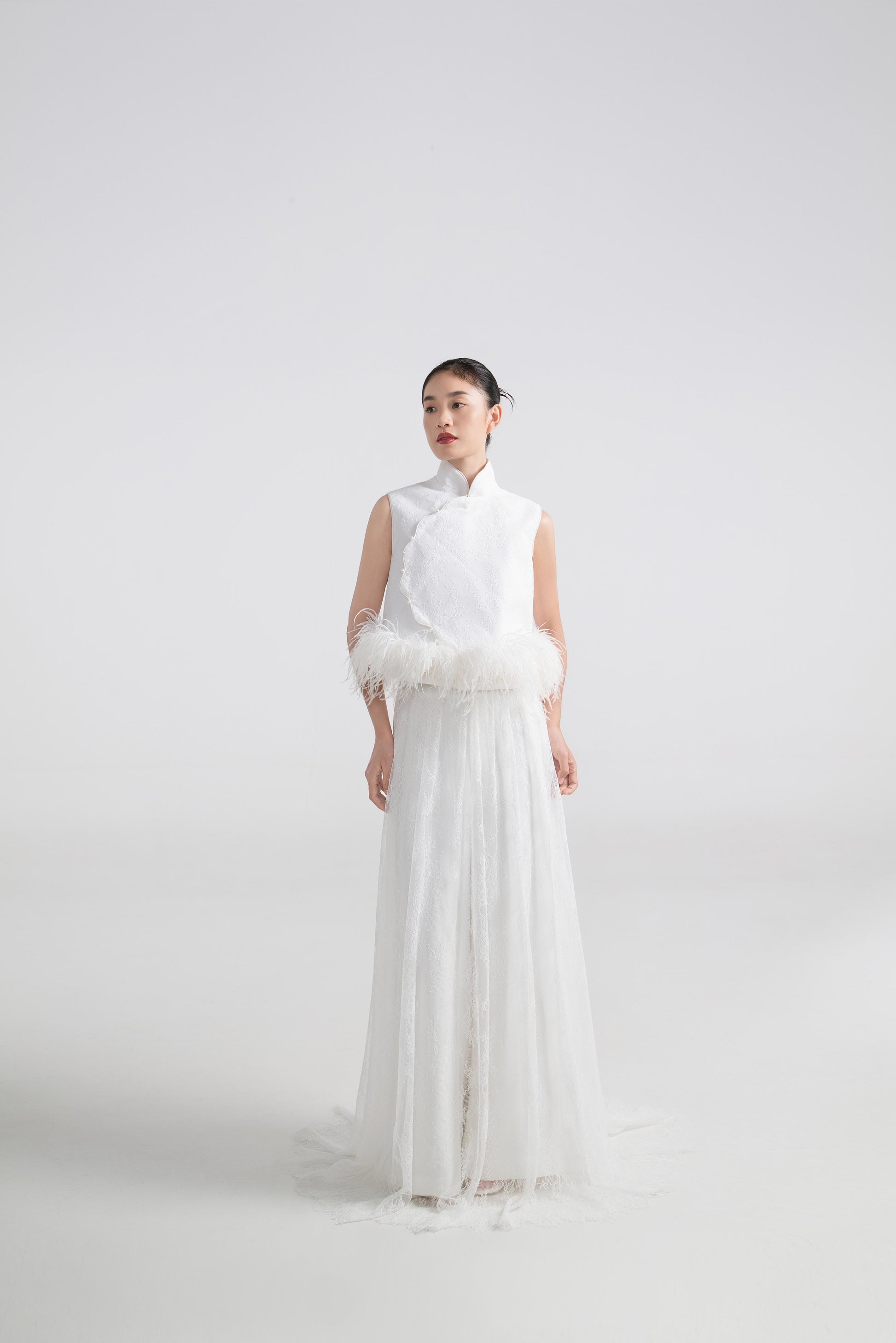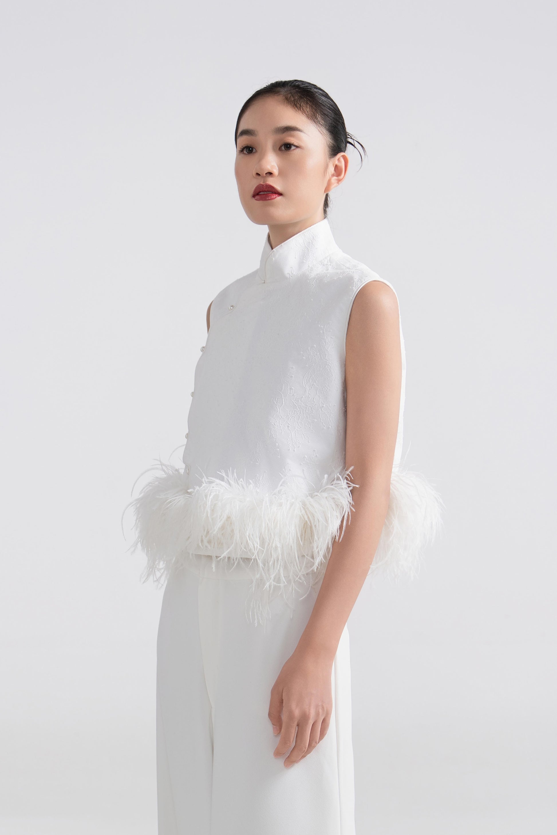 - 上衣为硬挺A字型,双层结构设计,下摆缀一圈羽毛,营造出轻盈又灵动的边缘感。