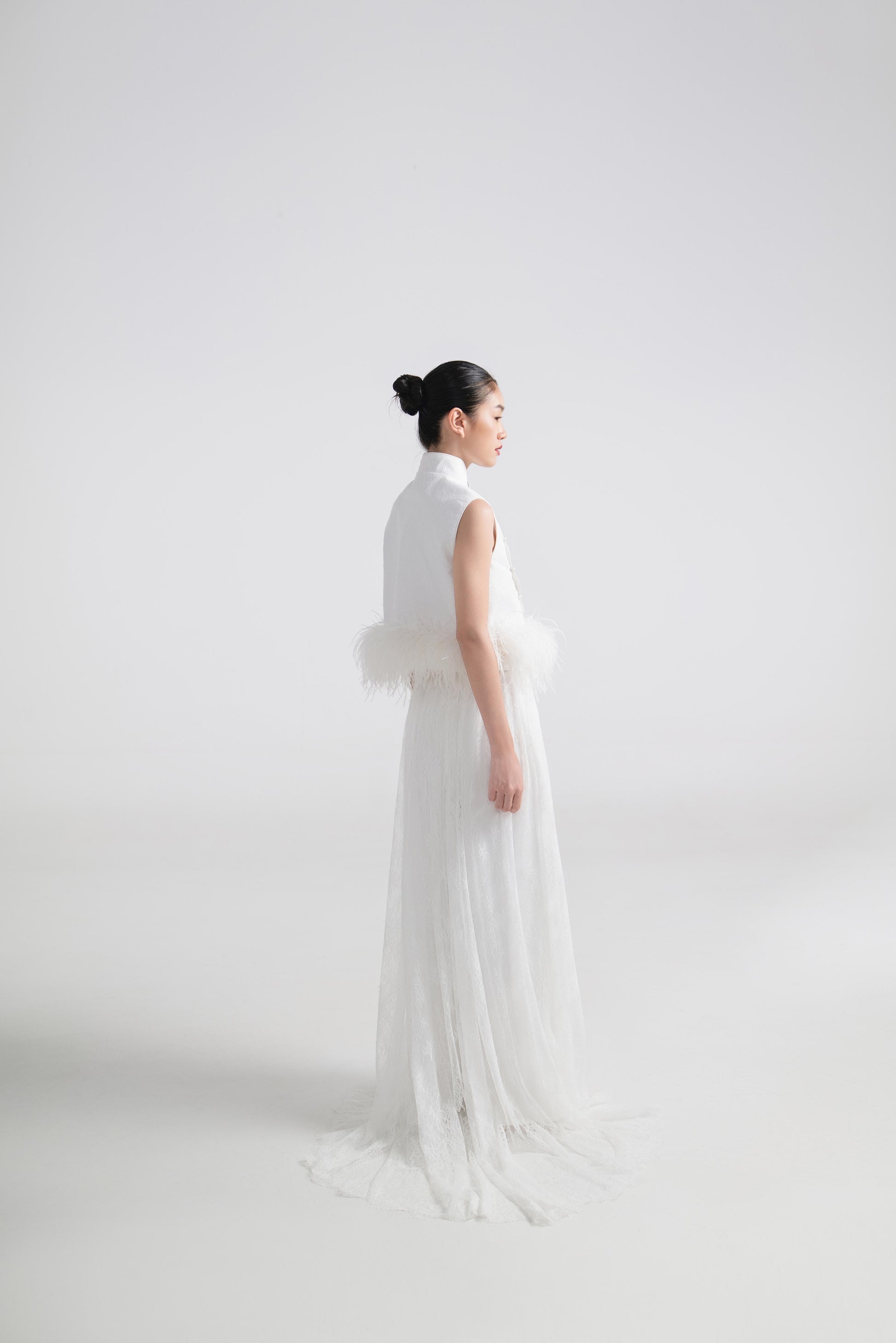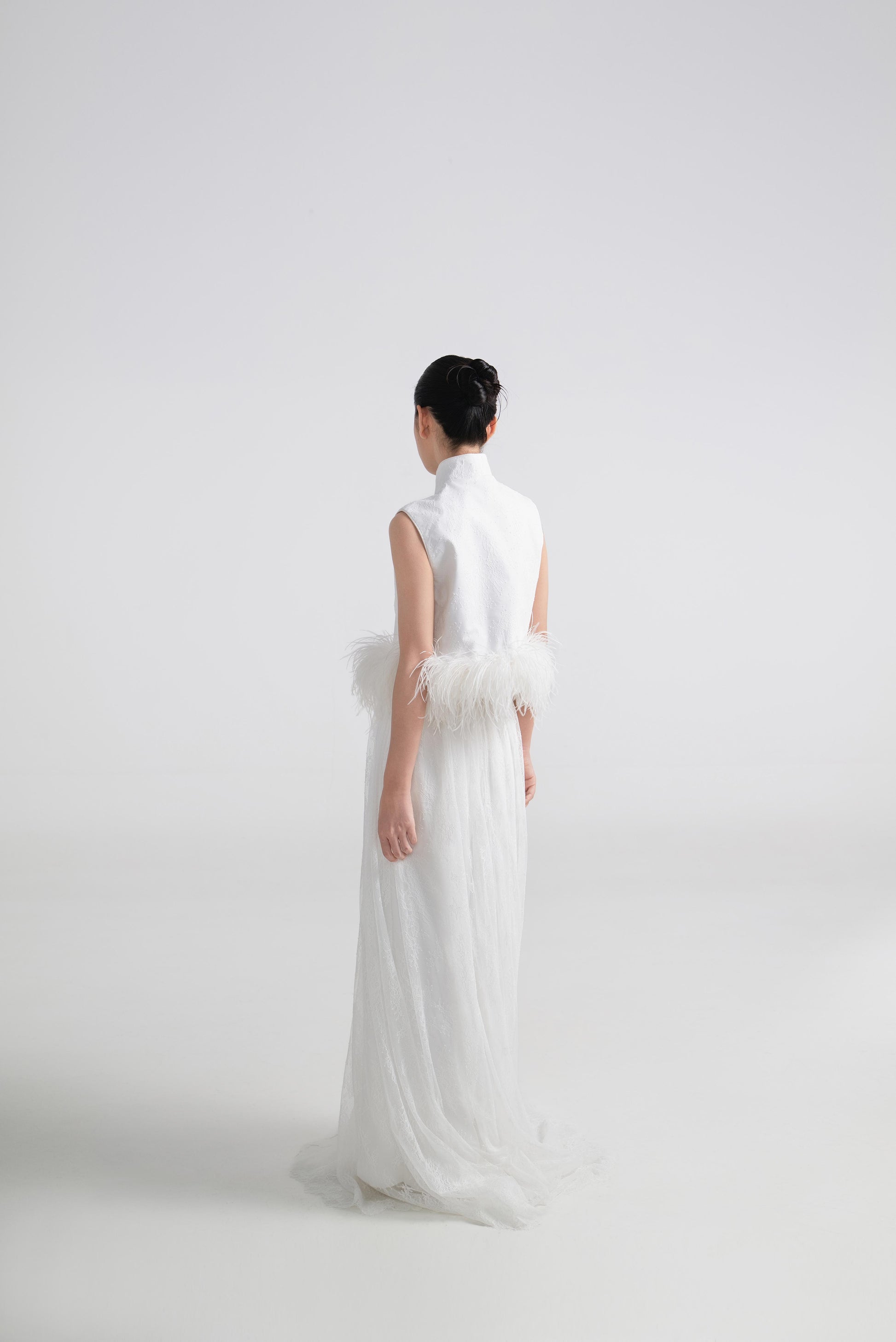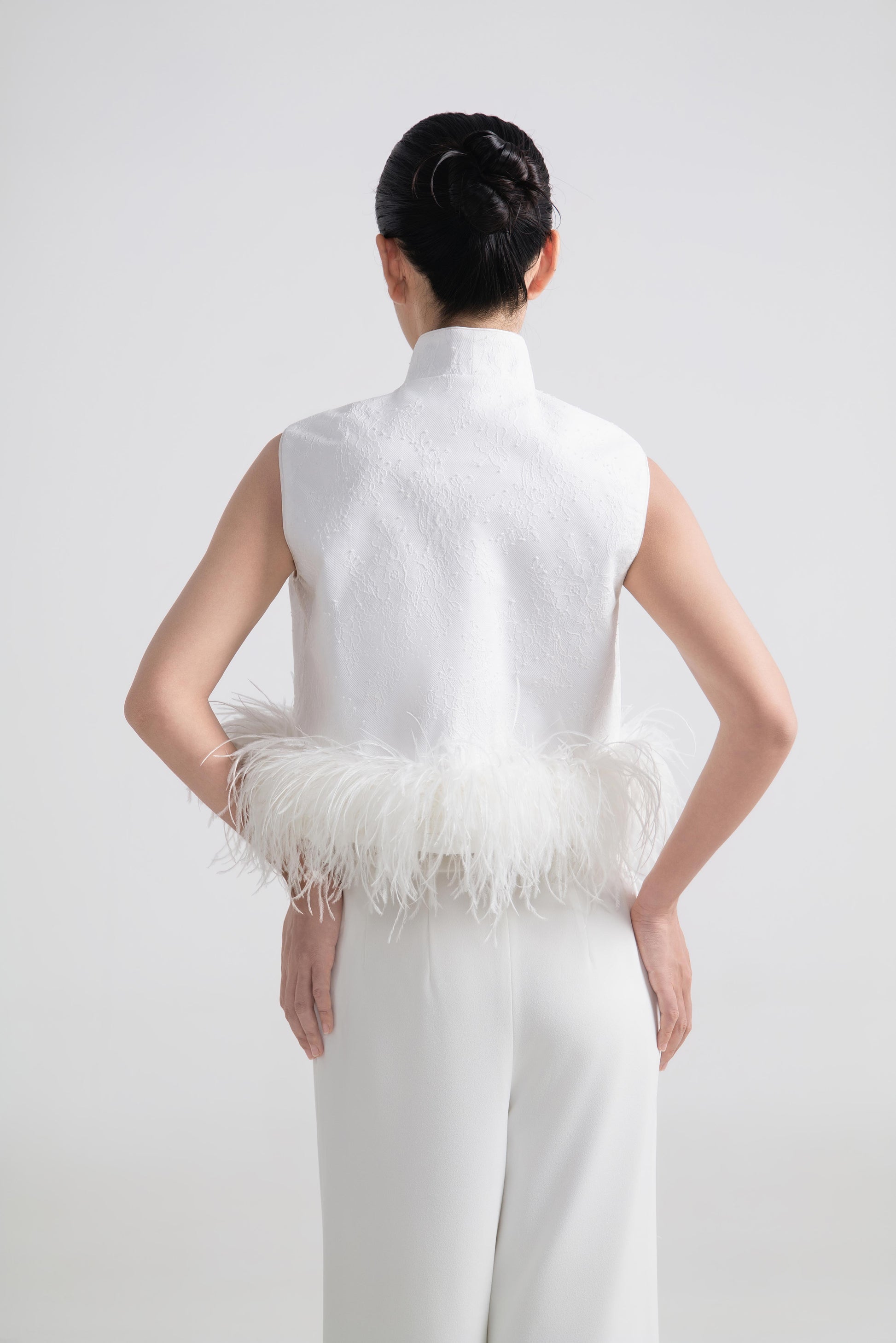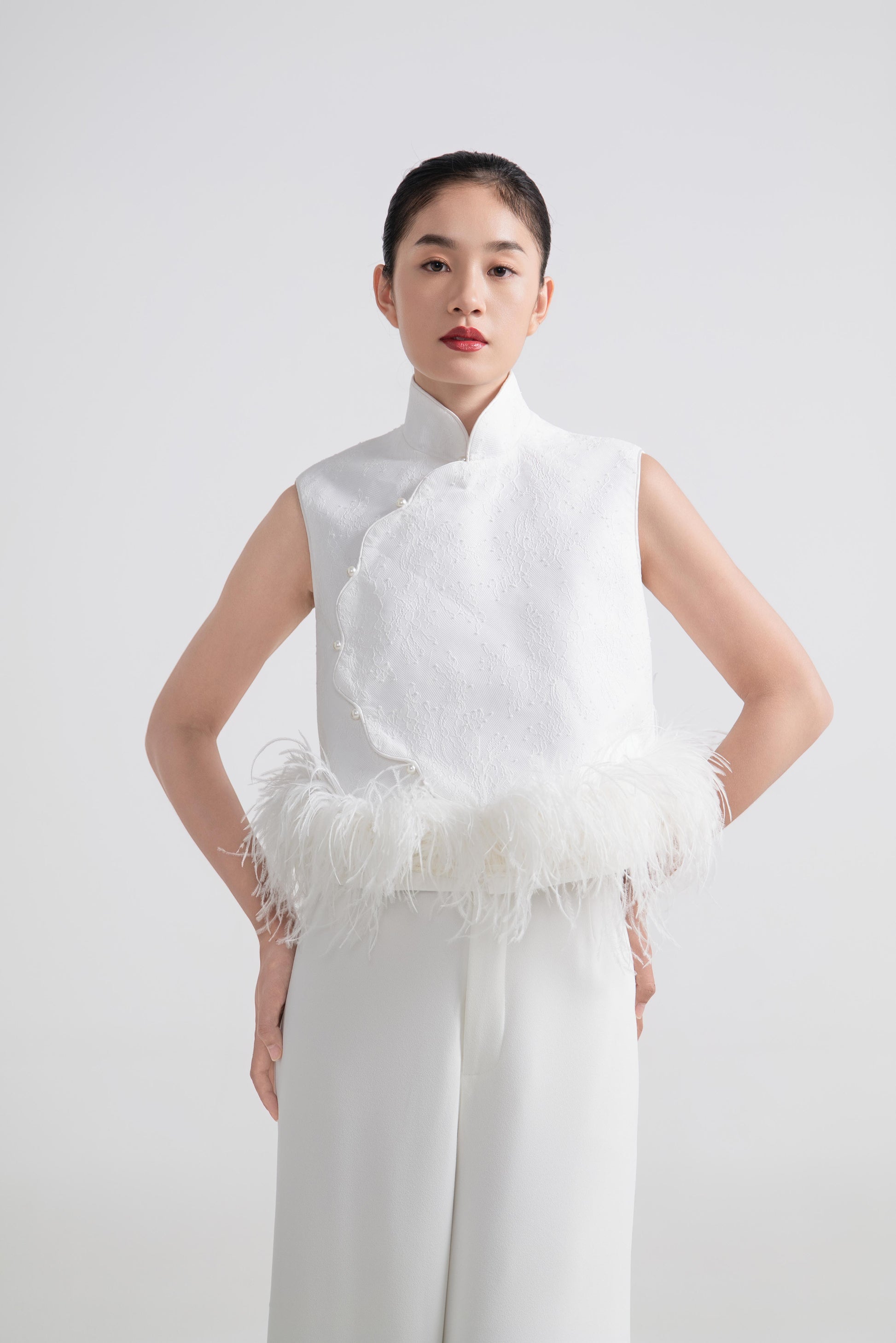 - 上衣为硬挺A字型,双层结构设计,下摆缀一圈羽毛,营造出轻盈又灵动的边缘感。