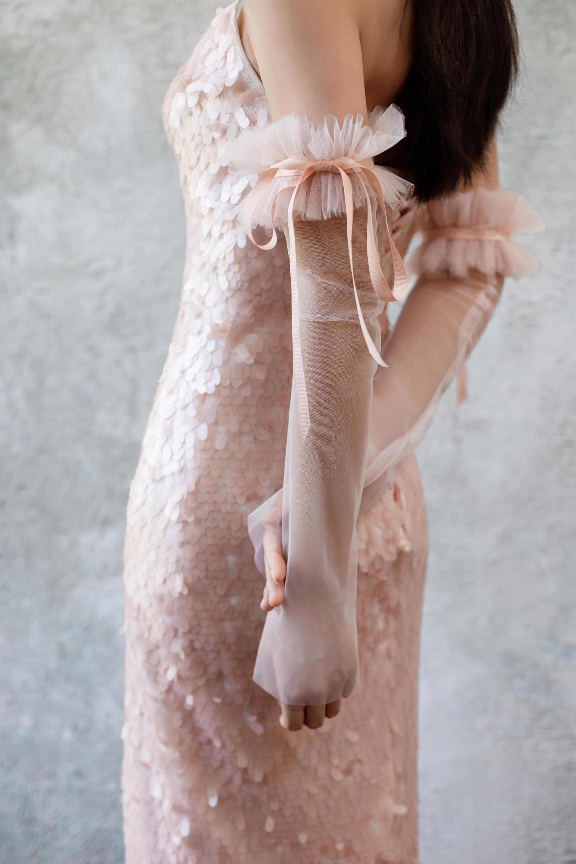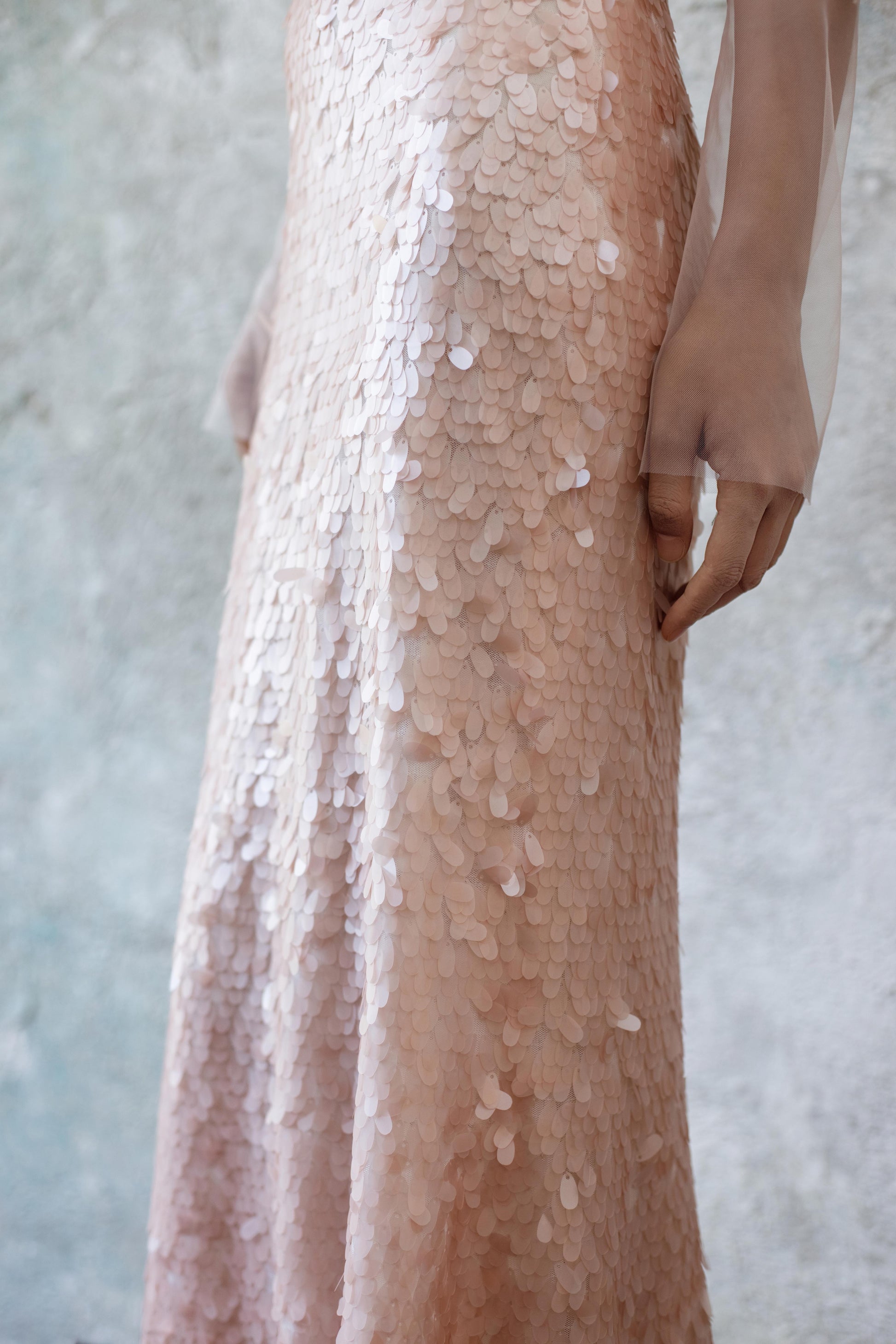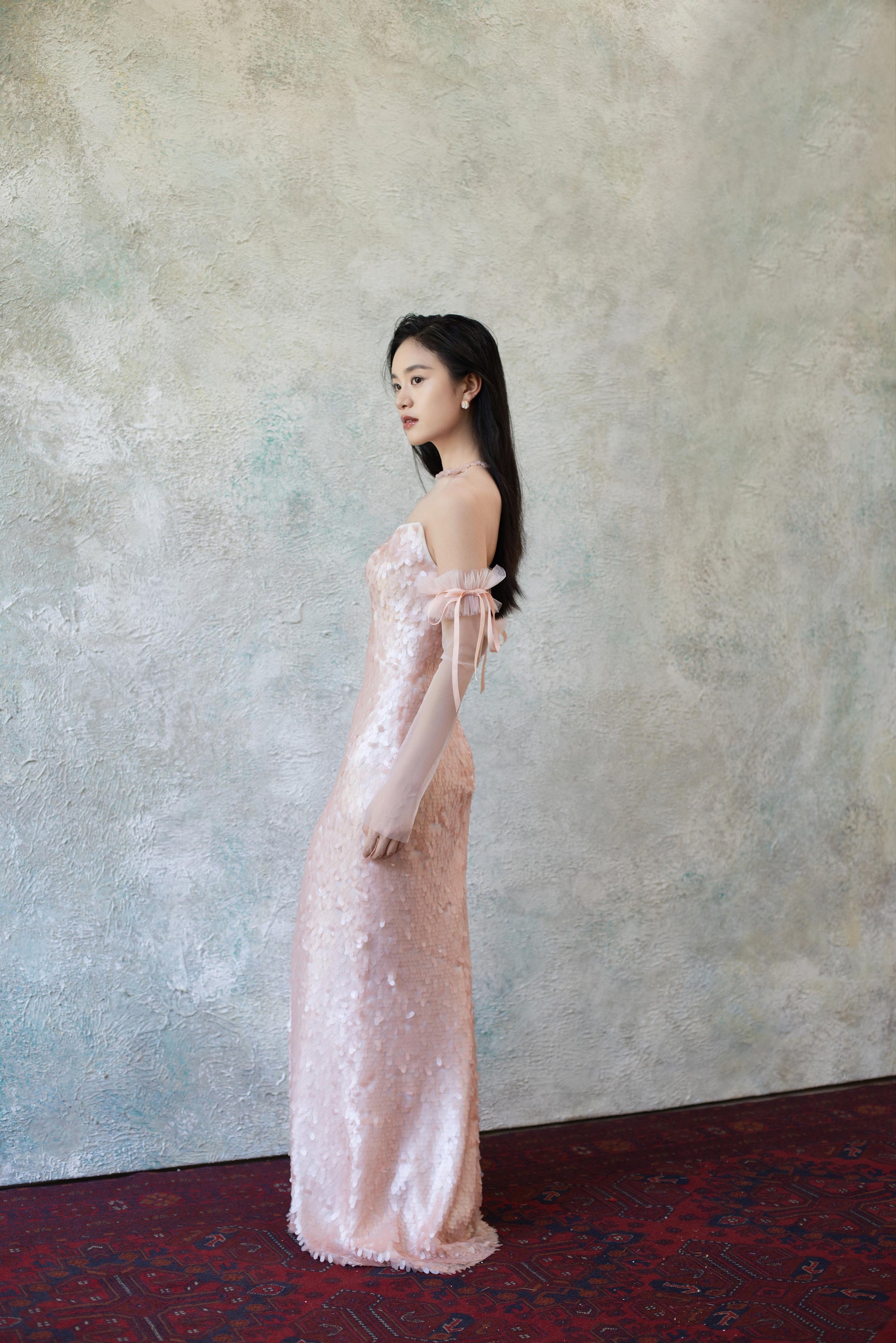 粉色哑光亮片网纱,温润不俗,像是海面在清晨微光下泛起的粼粼波光。