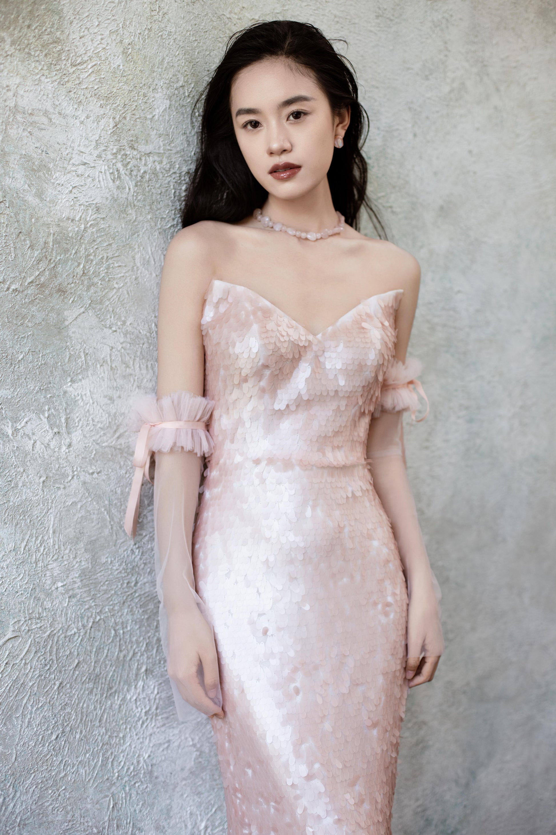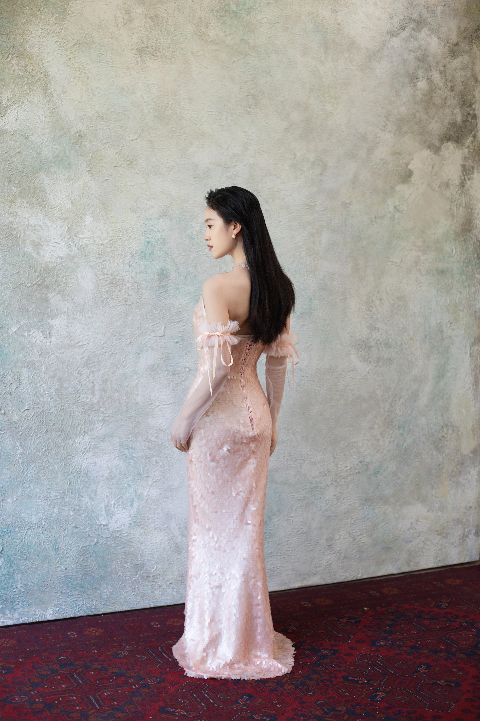 采用抹胸包身剪裁,自然勾勒女性曲线,整体廓形干净利落,融合西式礼服的典雅格调。