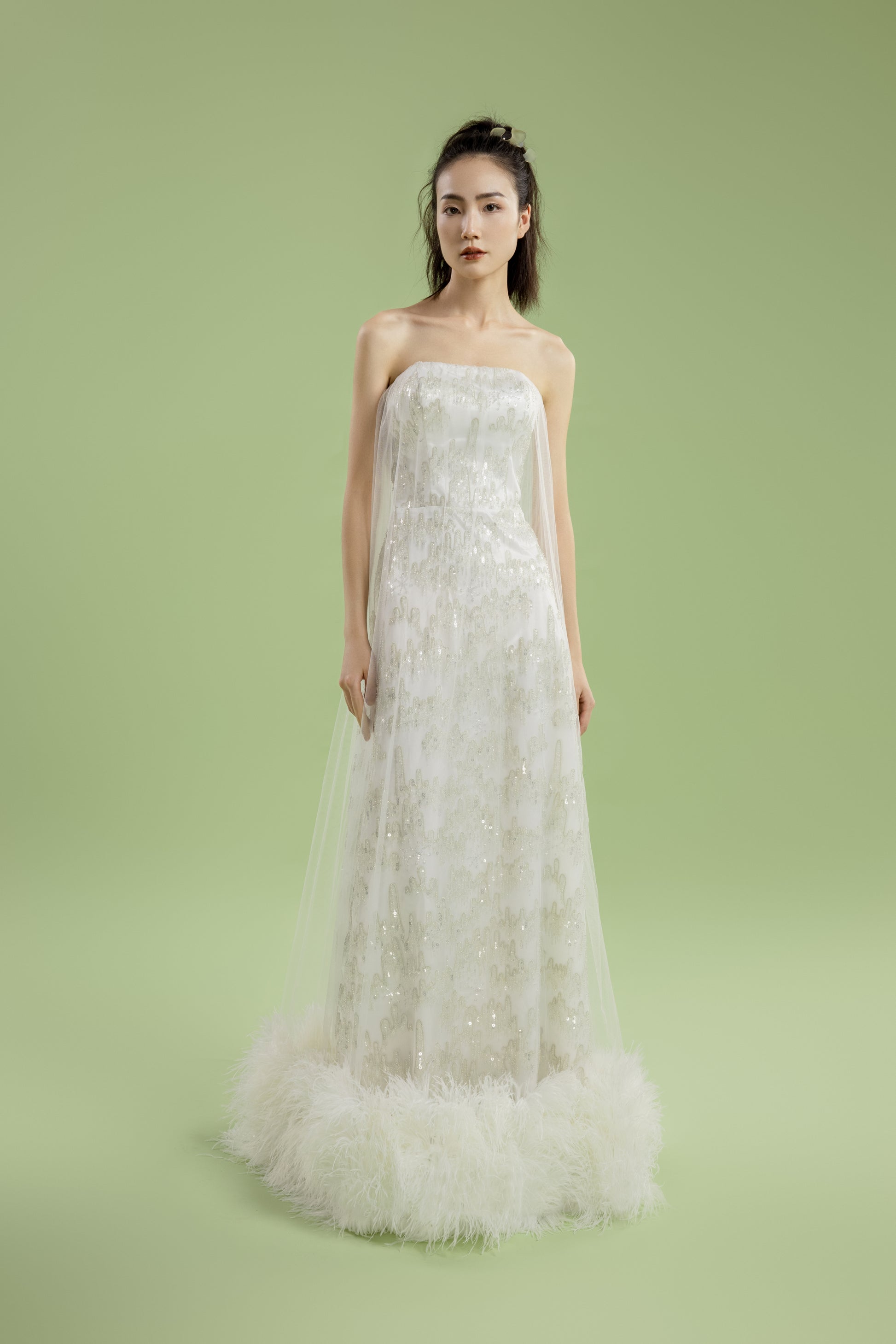 剪裁利落的A型抹胸裙,用华丽的蕾丝面料制作直线条的简约裙身,干净利落的裁剪出山涧的清澈气质,又透露出装饰主义的华丽感。