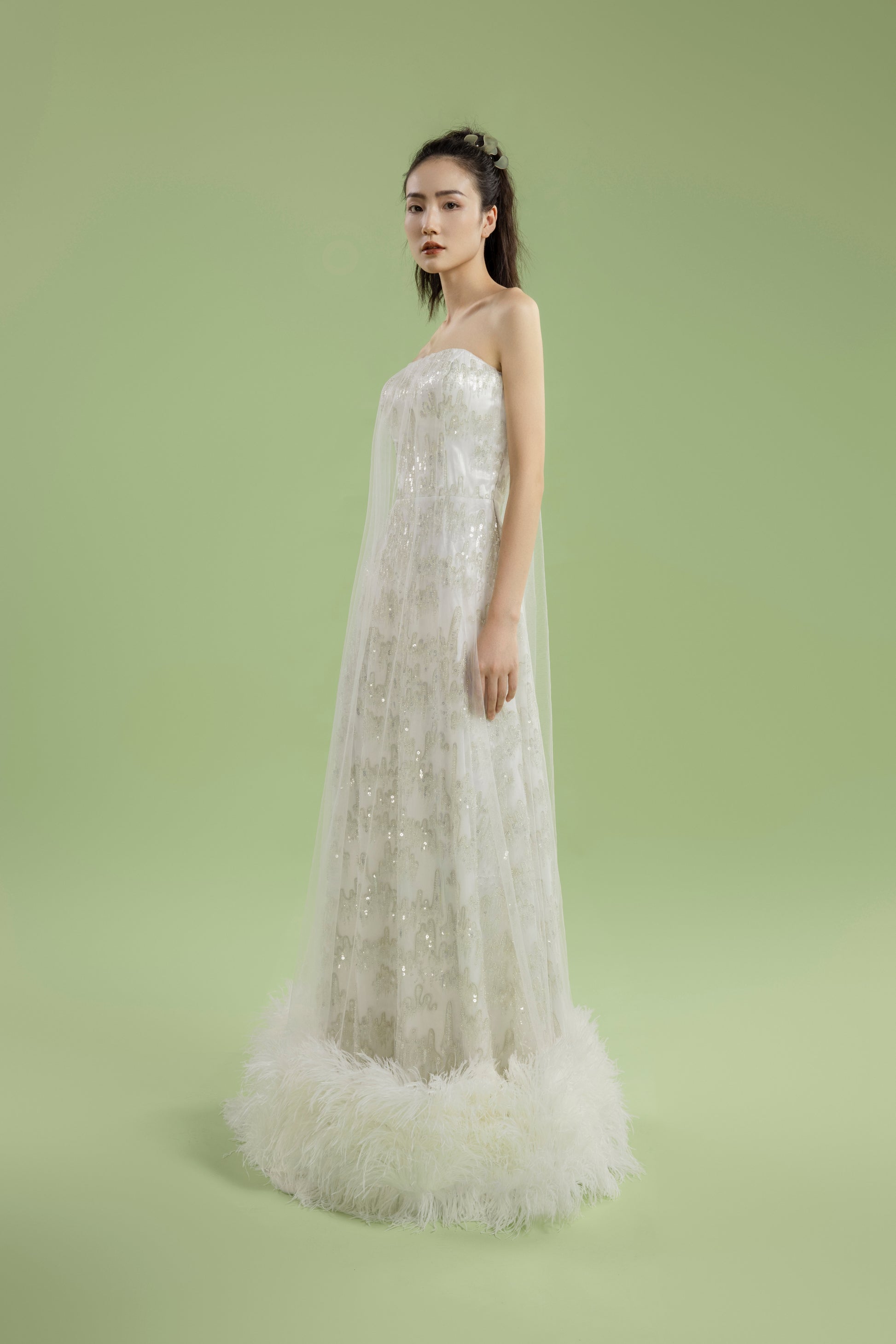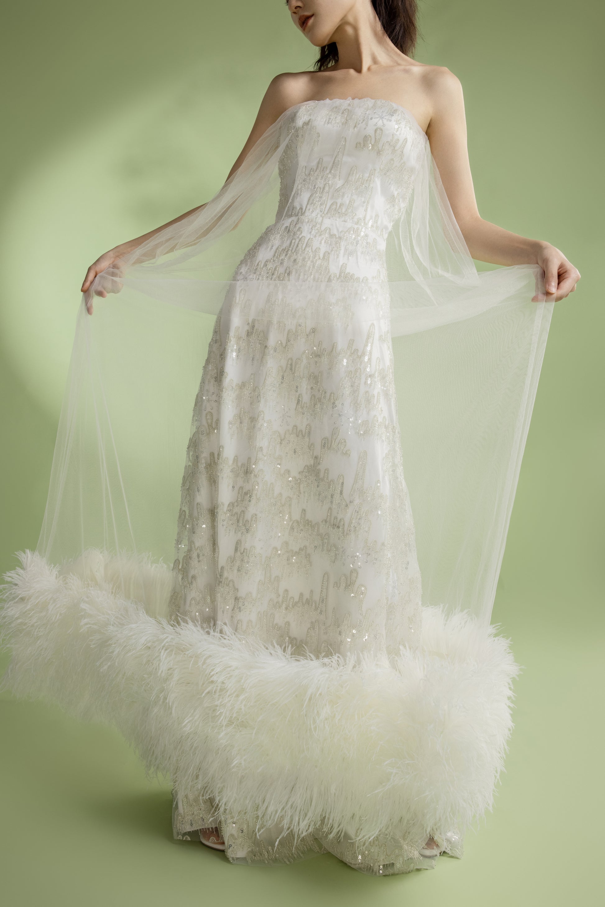 裙身外纱采用透感意大利网纱,用抽褶工艺营造水流的线条感,裙尾部织入约20cm高的鸵鸟毛做出垂感,模拟山涧触地时在脚边激起的水花。