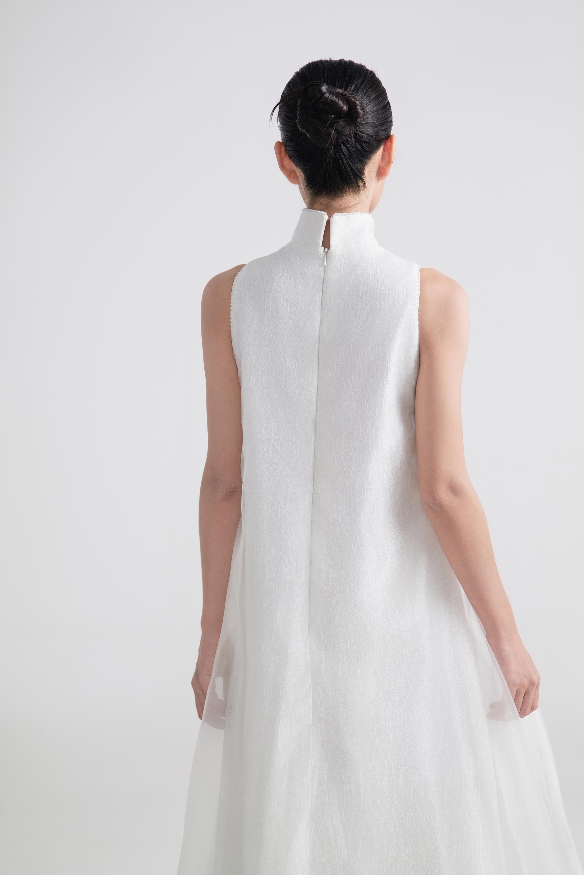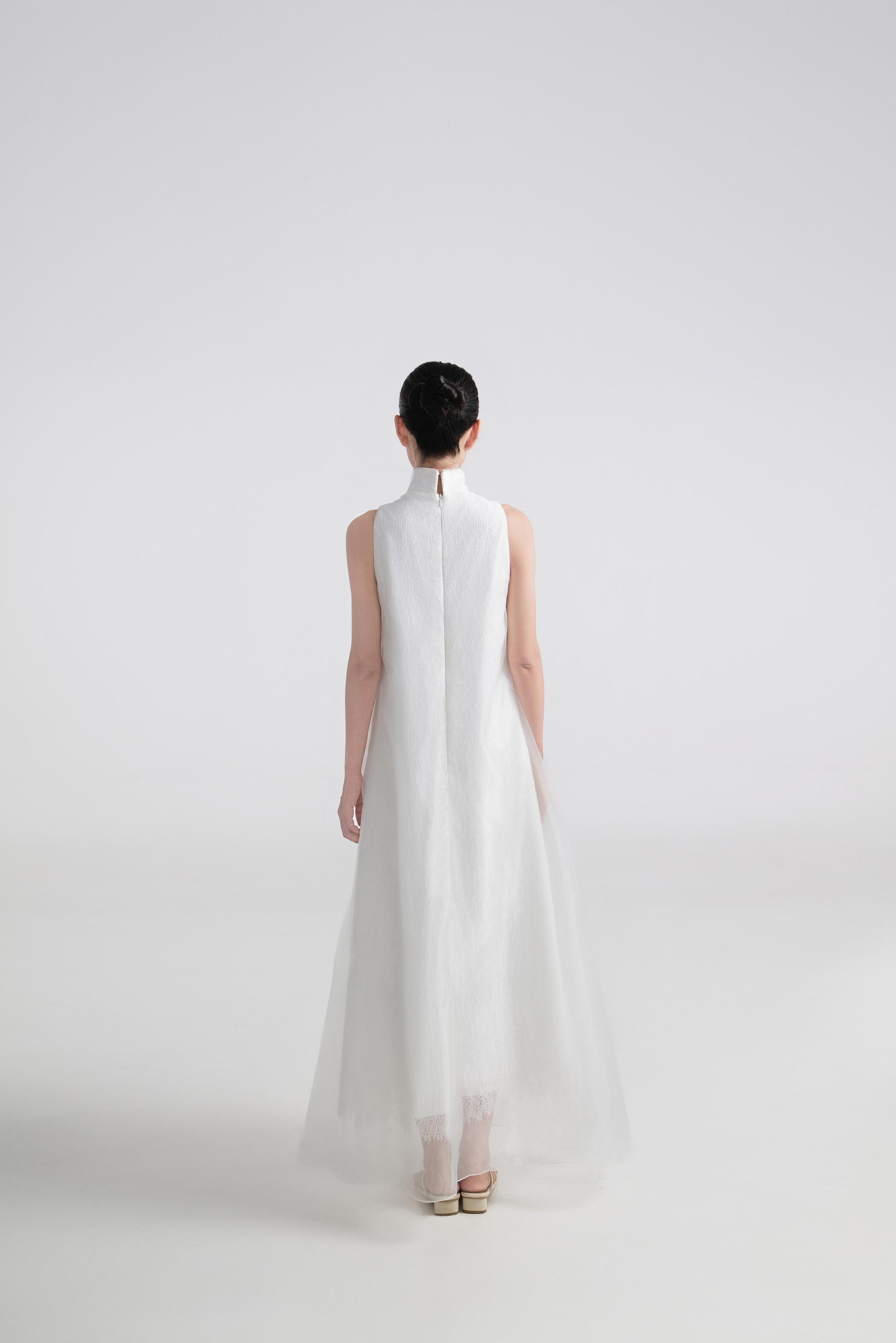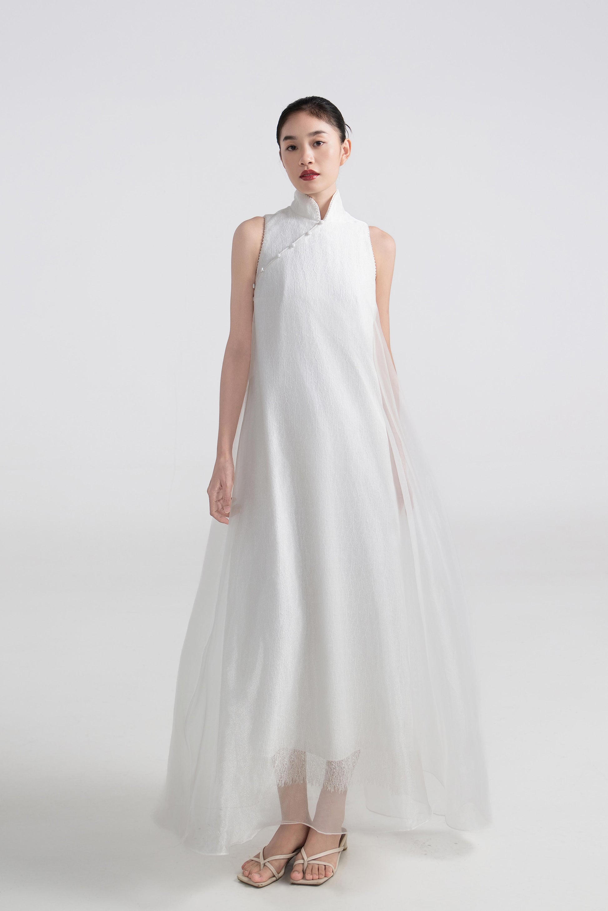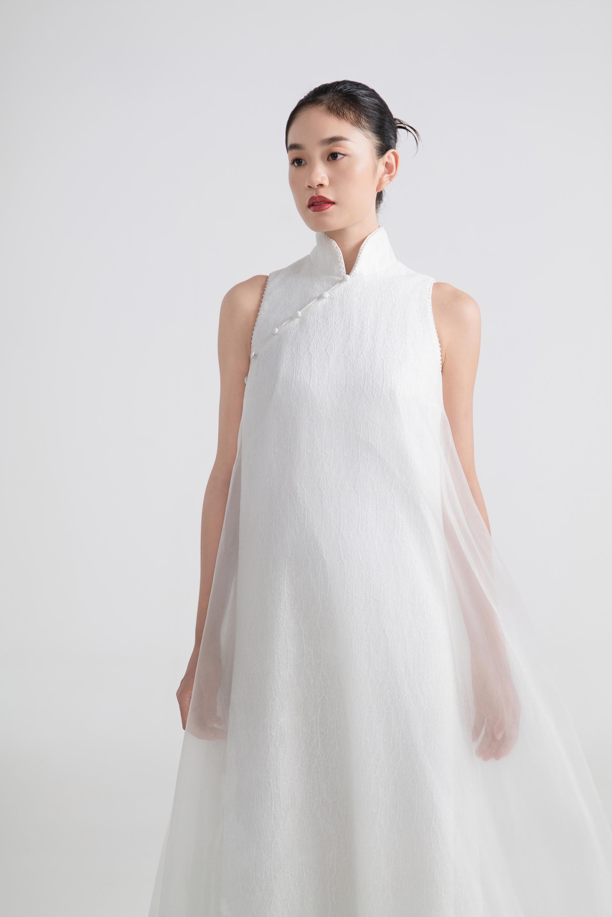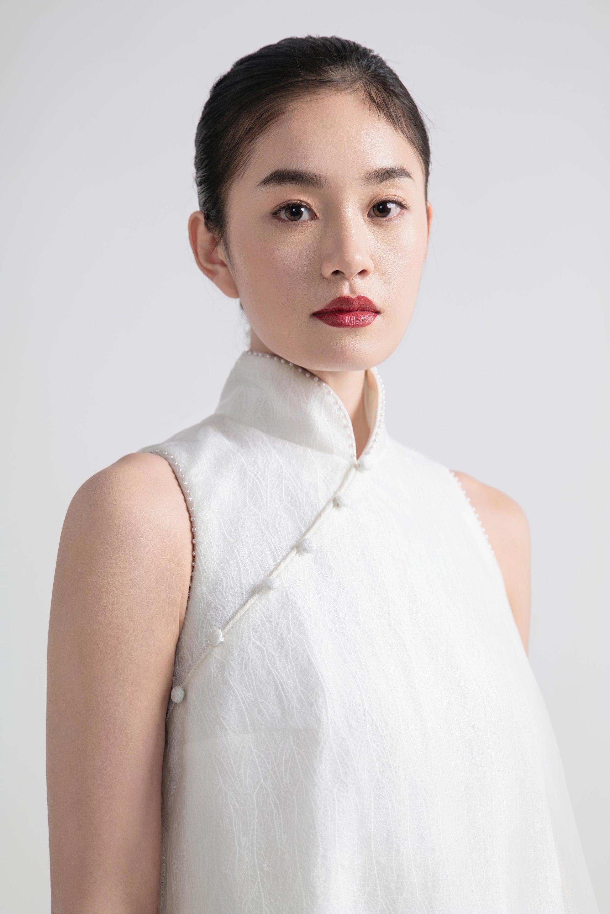 整体采用中式立领,搭配削肩设计,让线条更立体修长。