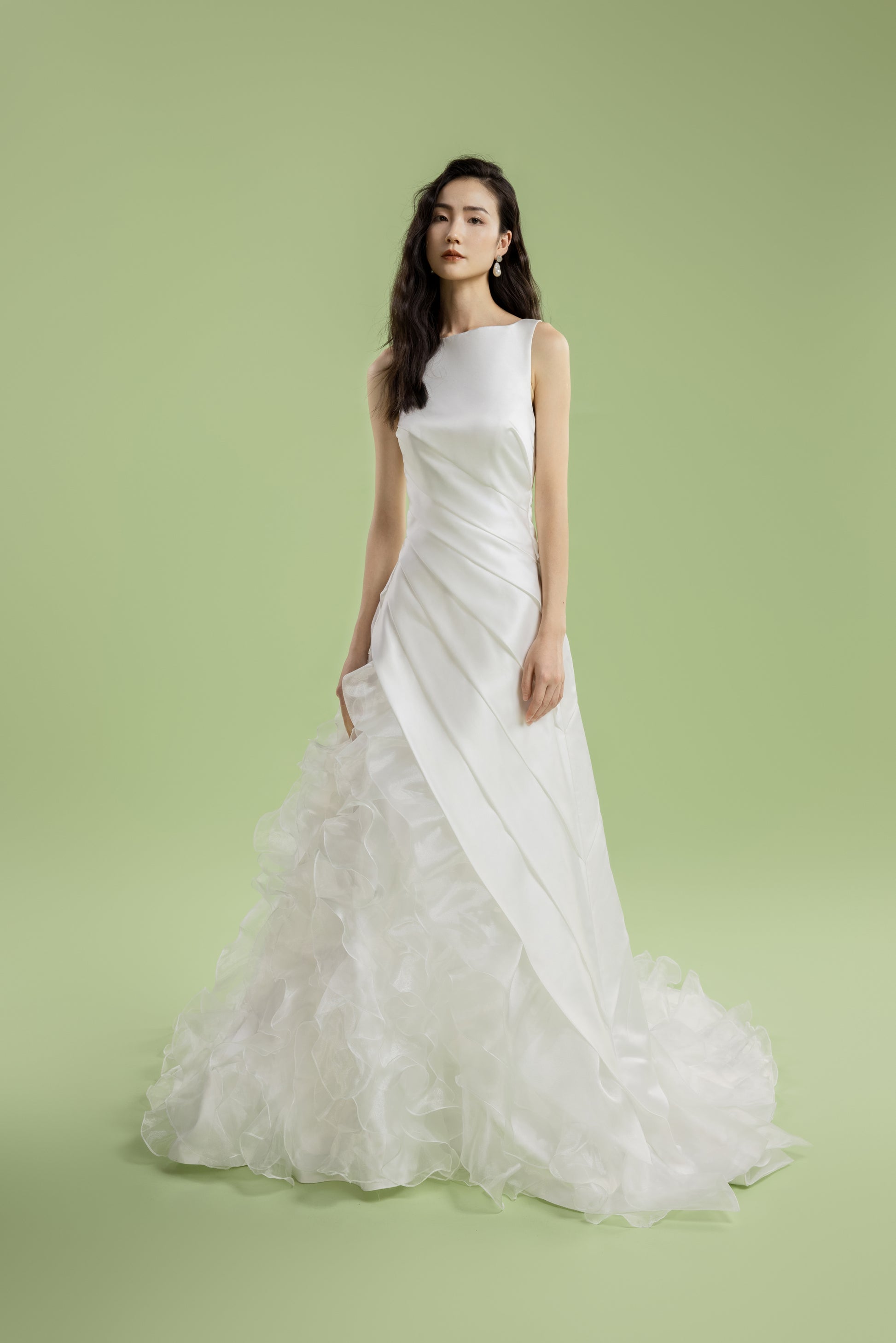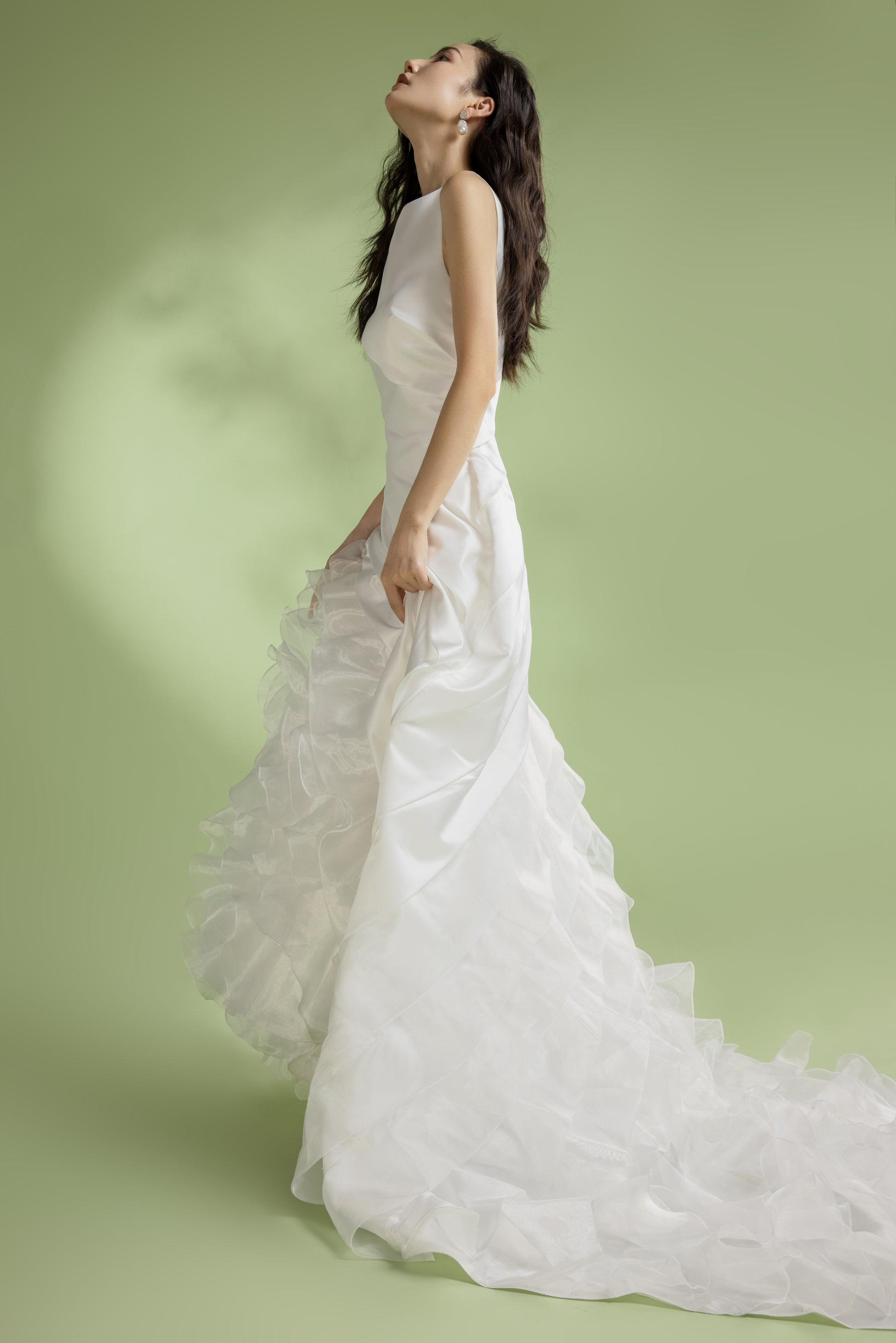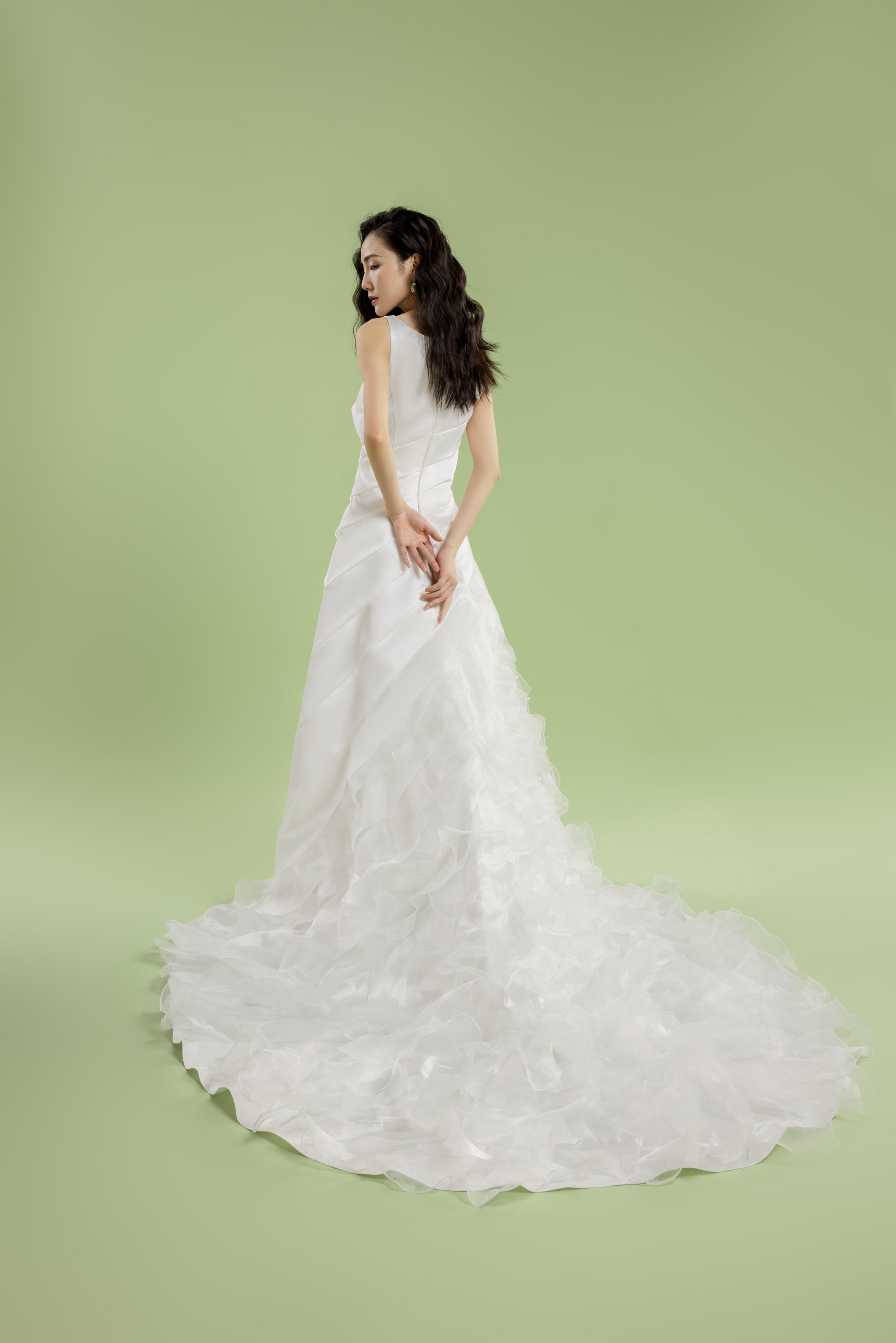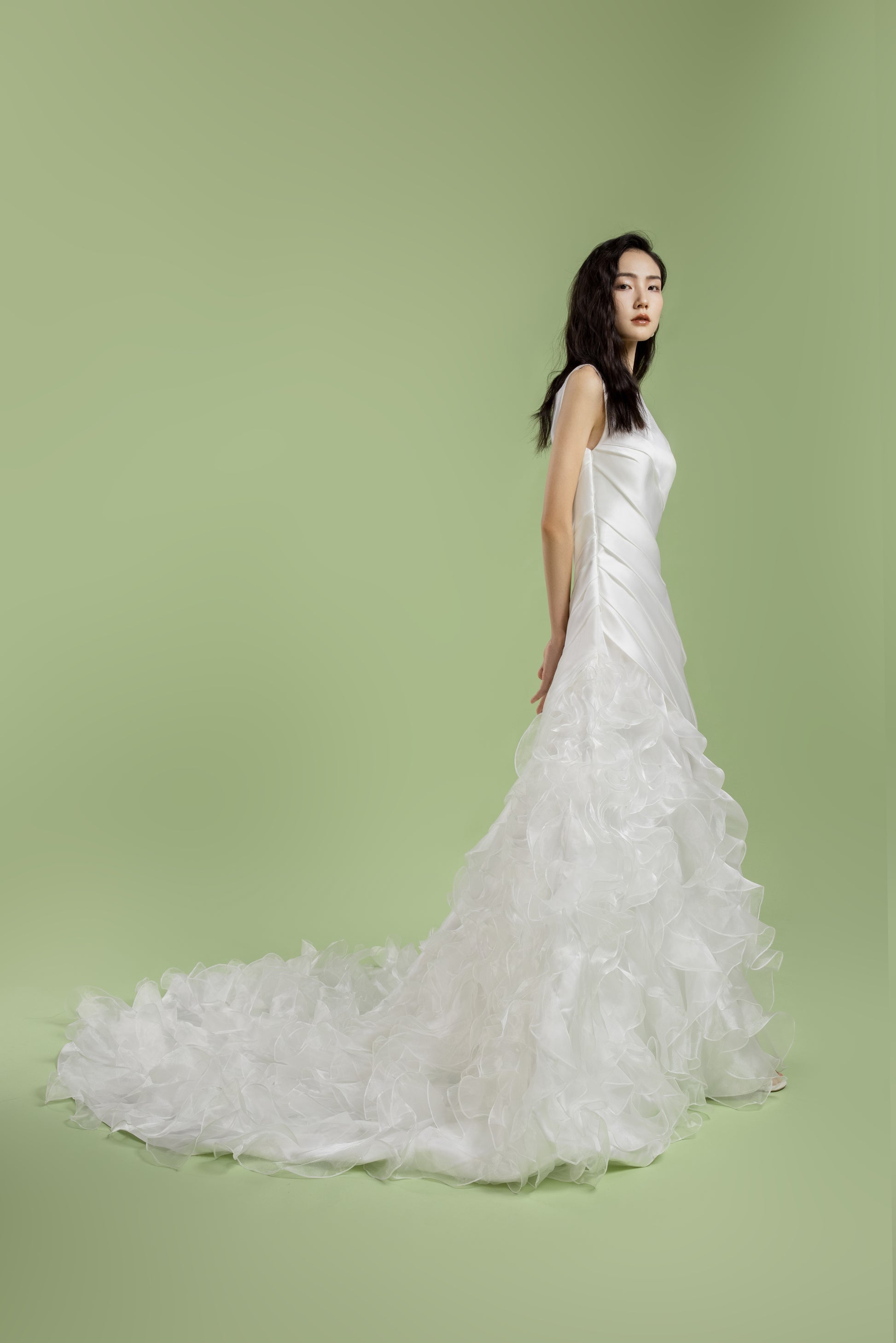 裙身用轻透微闪的欧根纱堆积形成不同疏密的褶皱,构成波澜般1米长的荷叶边拖尾,营造壮阔之感