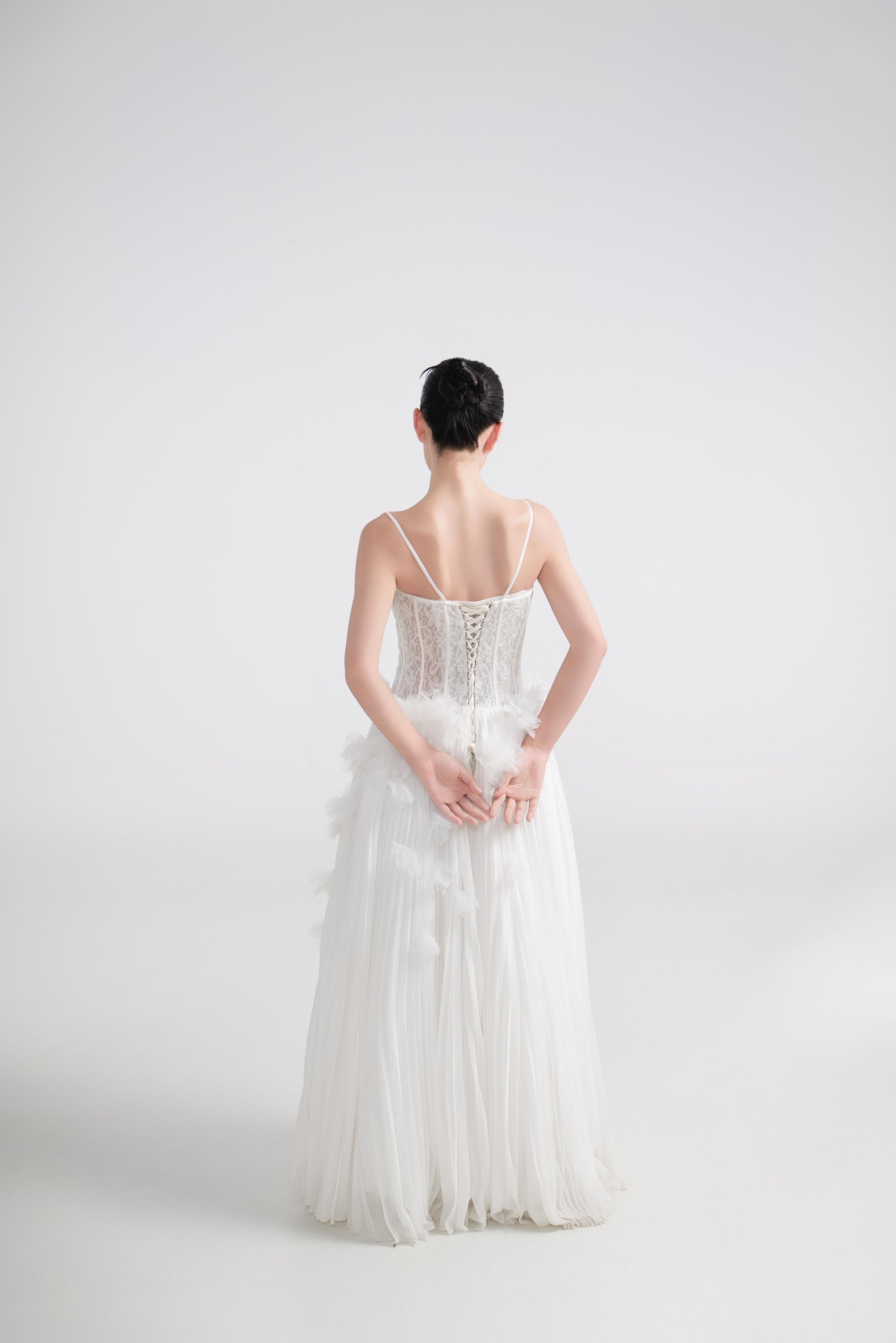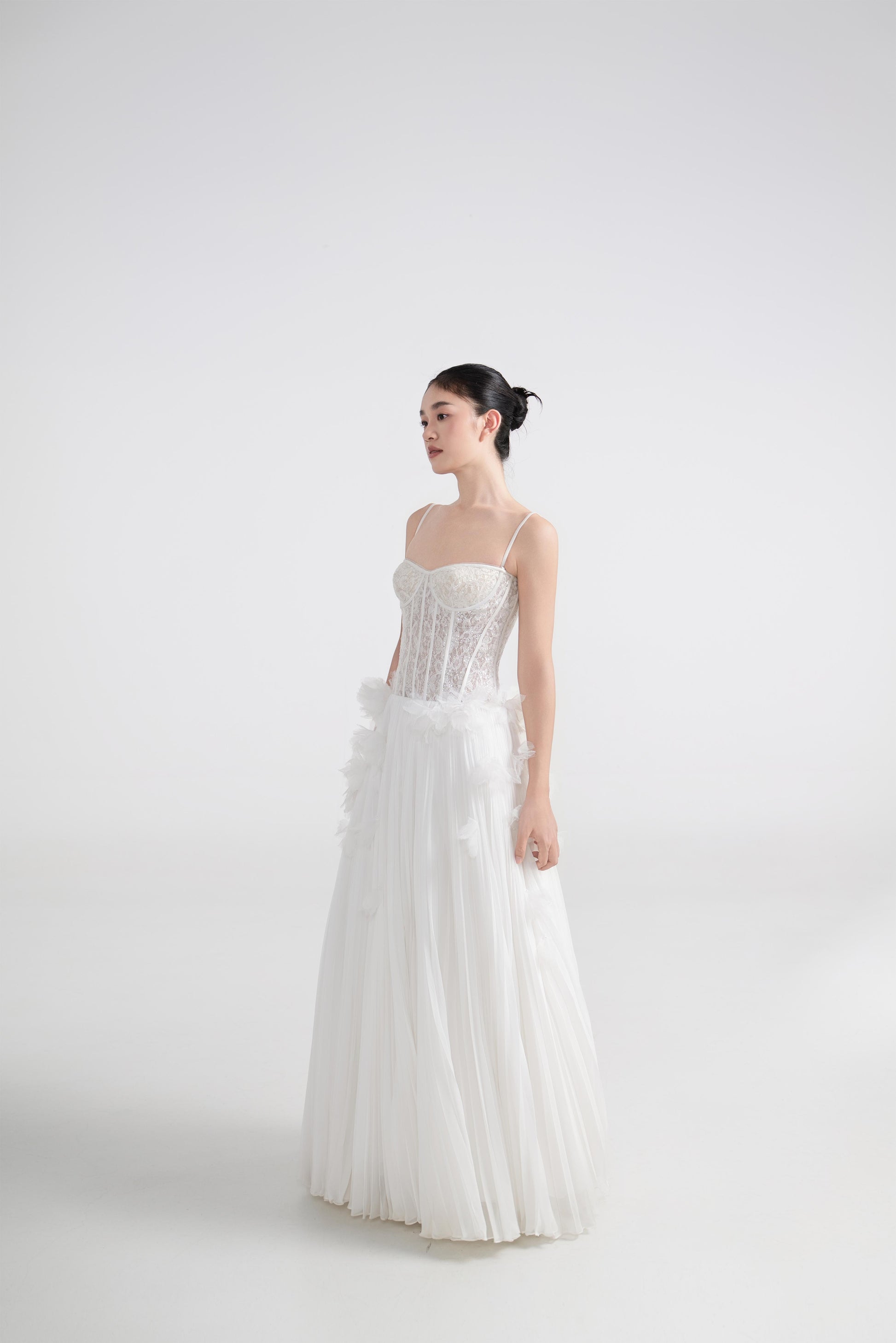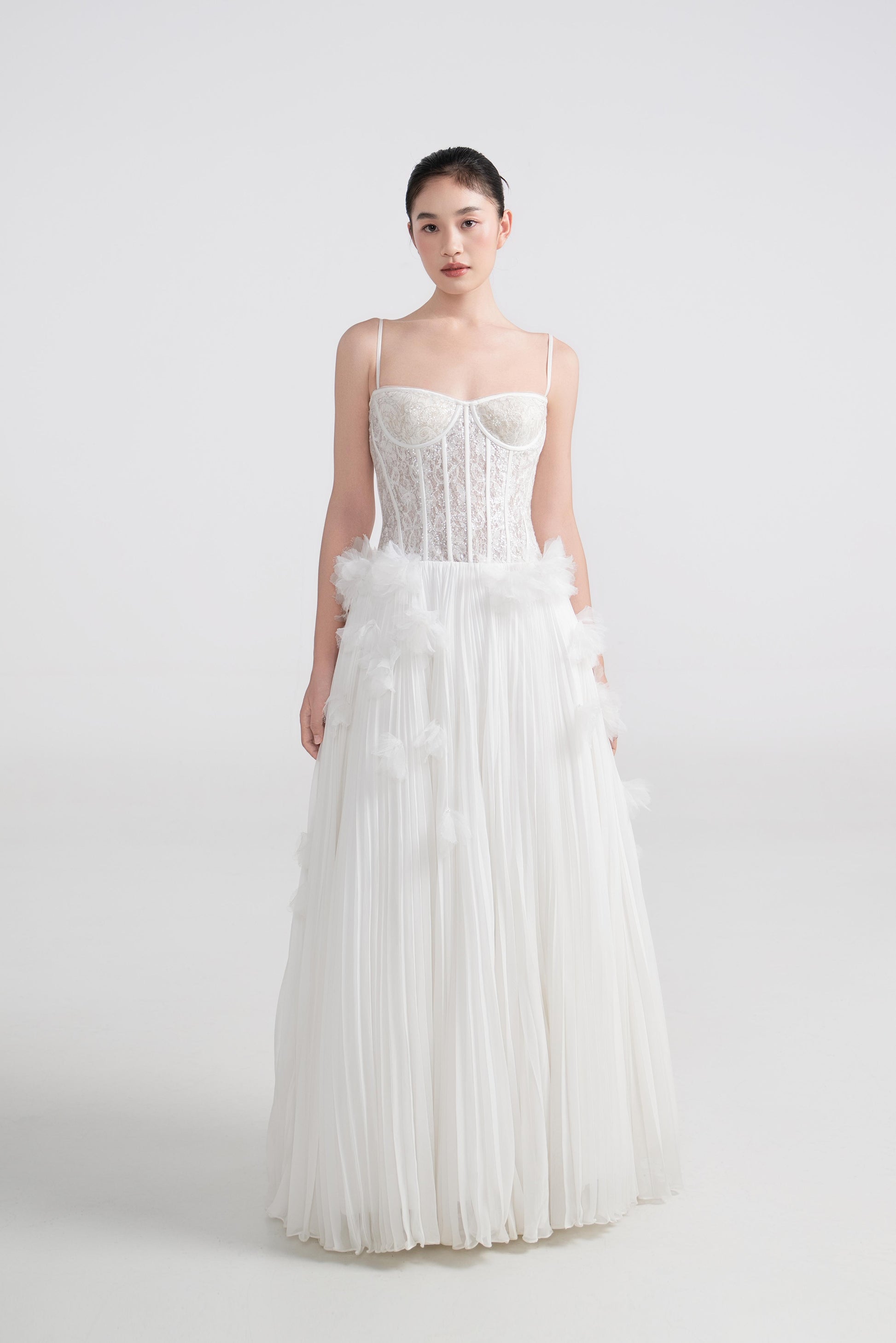 - 太阳褶裙身,线条自然散开,增加立体感与动感。