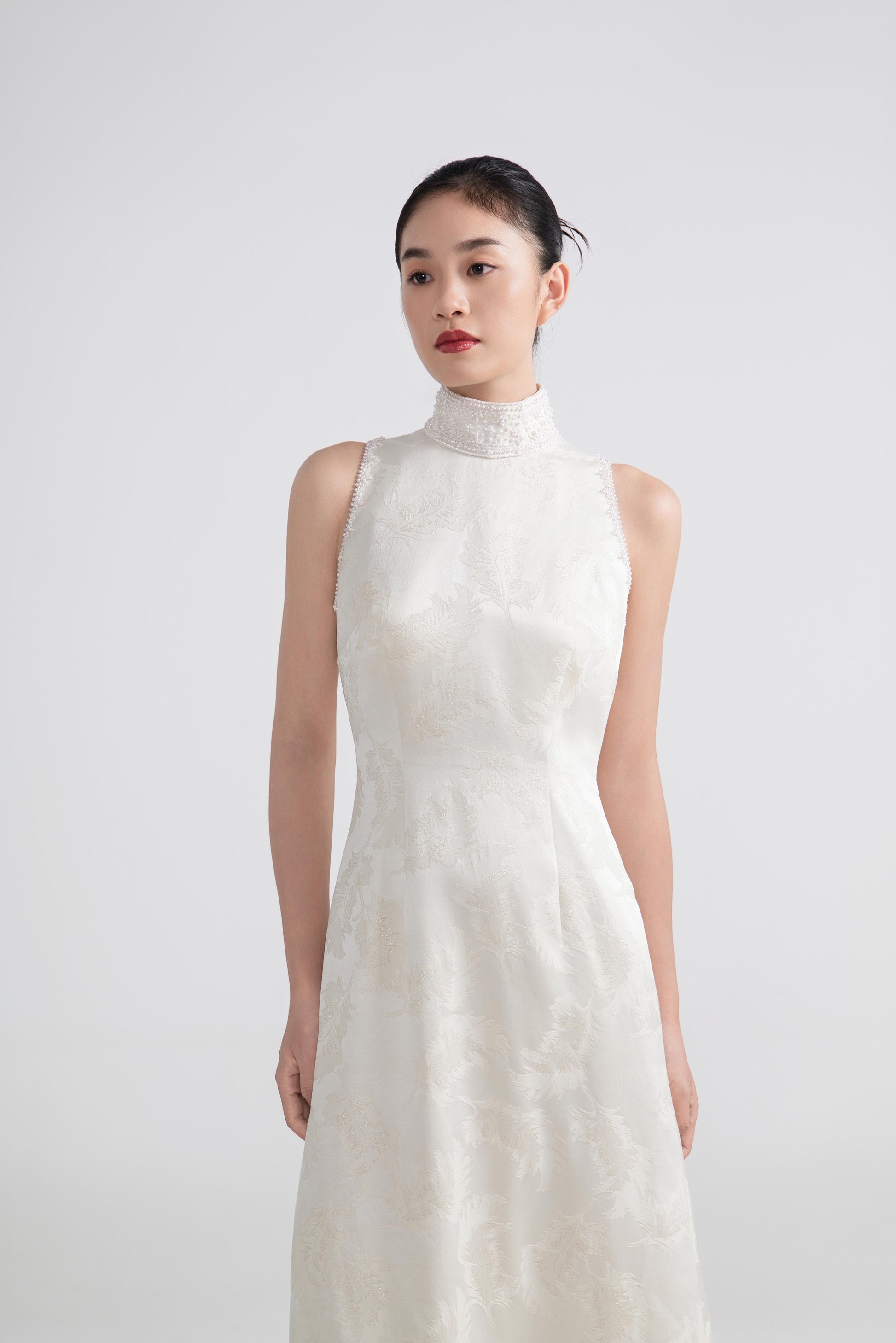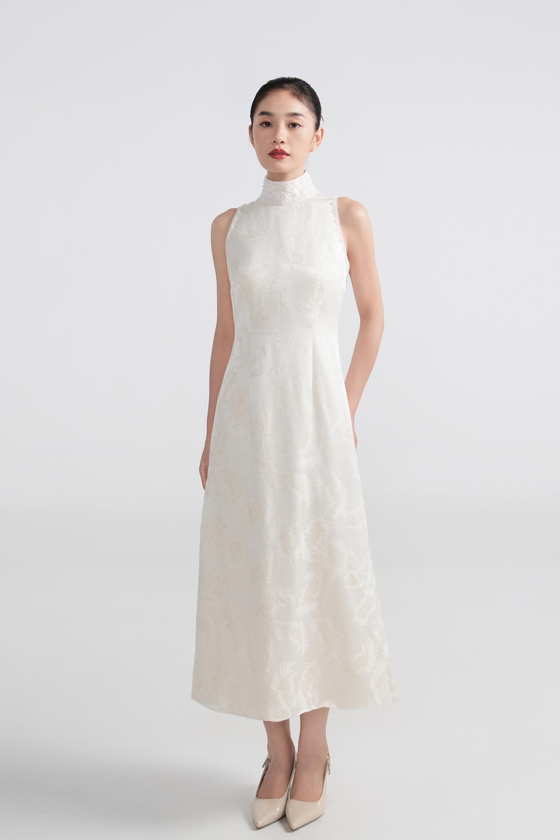 - 中式立领与削肩设计,利落之中勾勒颈肩的柔和曲线。