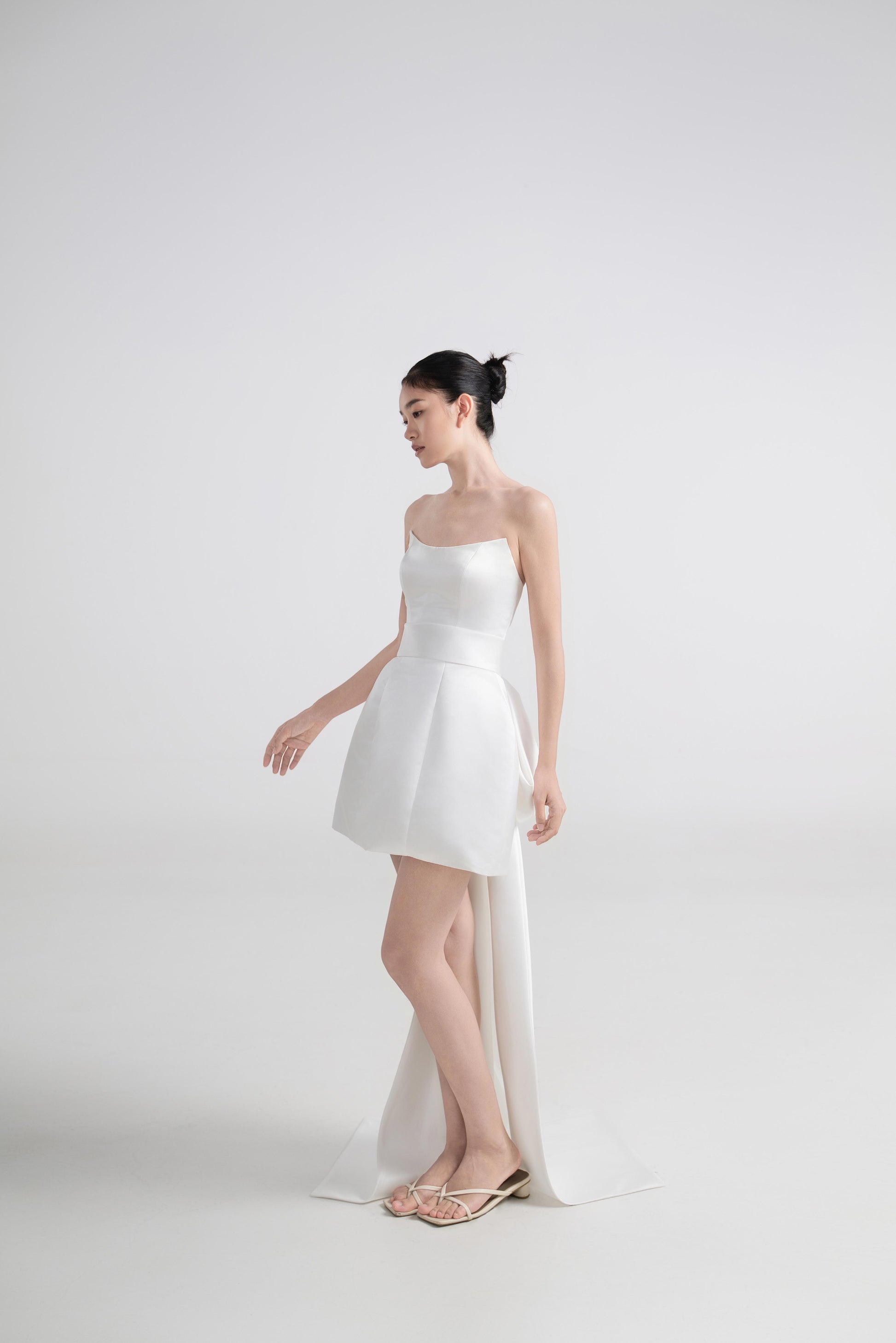 - 抹胸短裙设计,领口向上弧度巧妙修饰副乳,凸显肩颈线条。