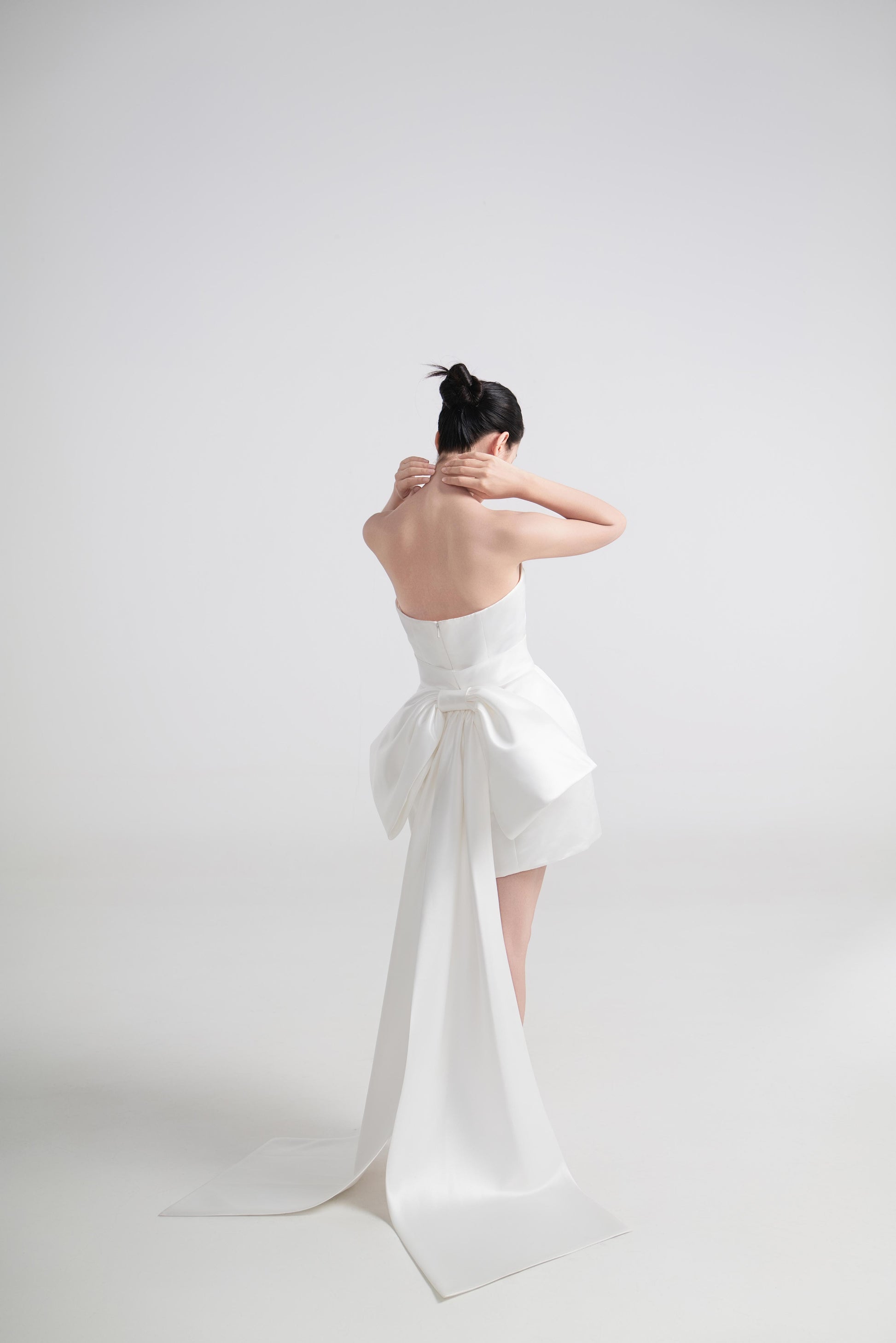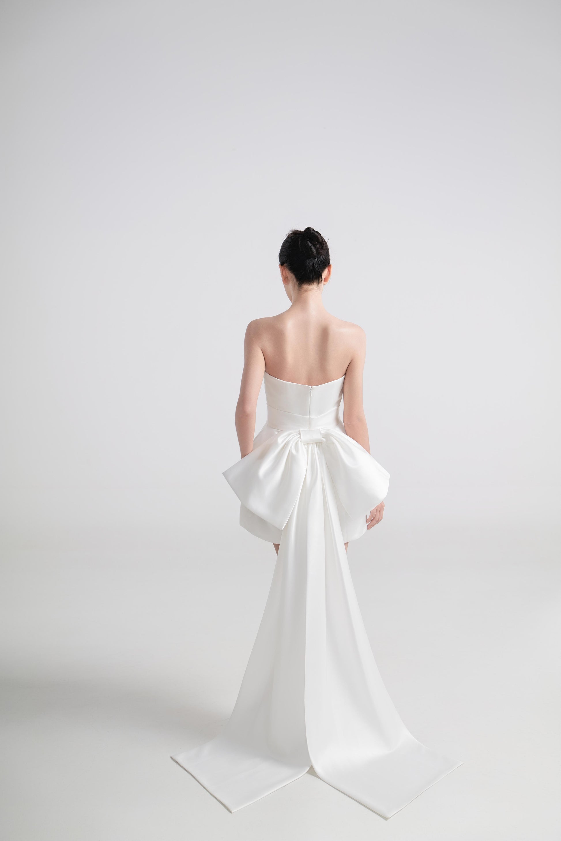 - 后背蝴蝶结拖尾,行走间轻轻摆动,浪漫感满分。