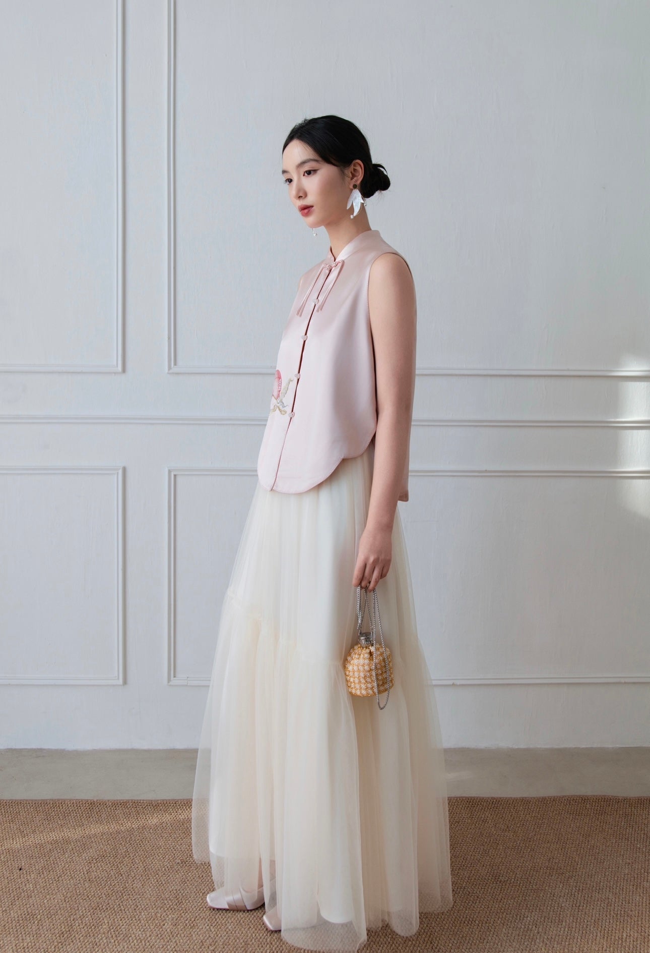上衣醋酸缎面莫兰迪粉,花瓣形下摆轻盈自然,刺绣桃子寓意美满爱情,领口手工一字扣精致细腻。