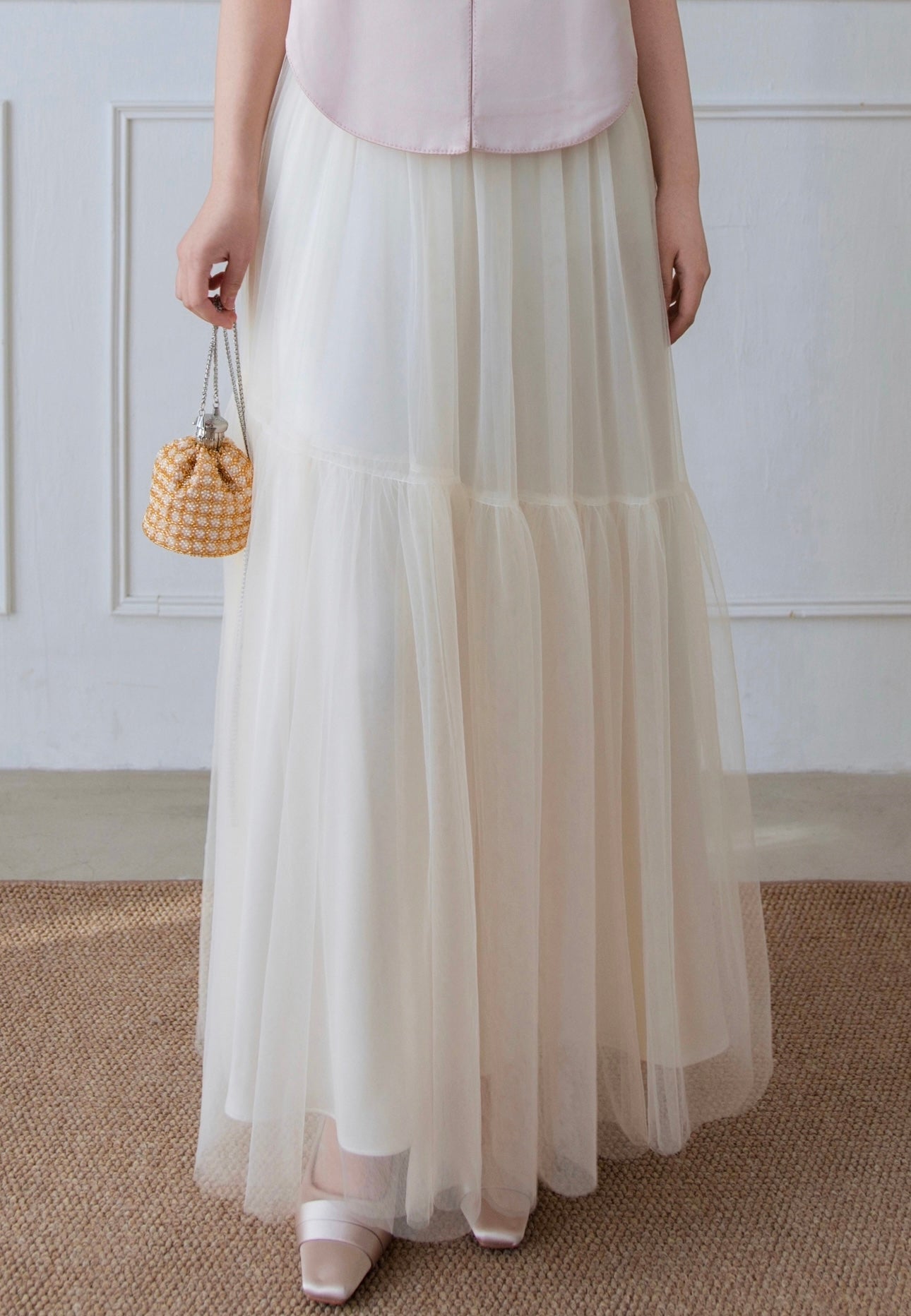 米色网纱褶皱半裙通透温柔,醋酸缎光泽微透,活泼自然;