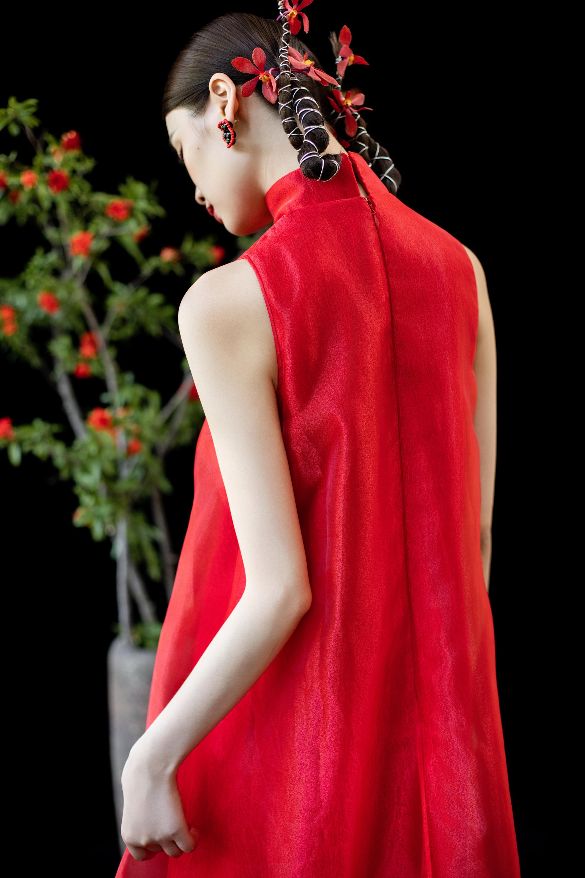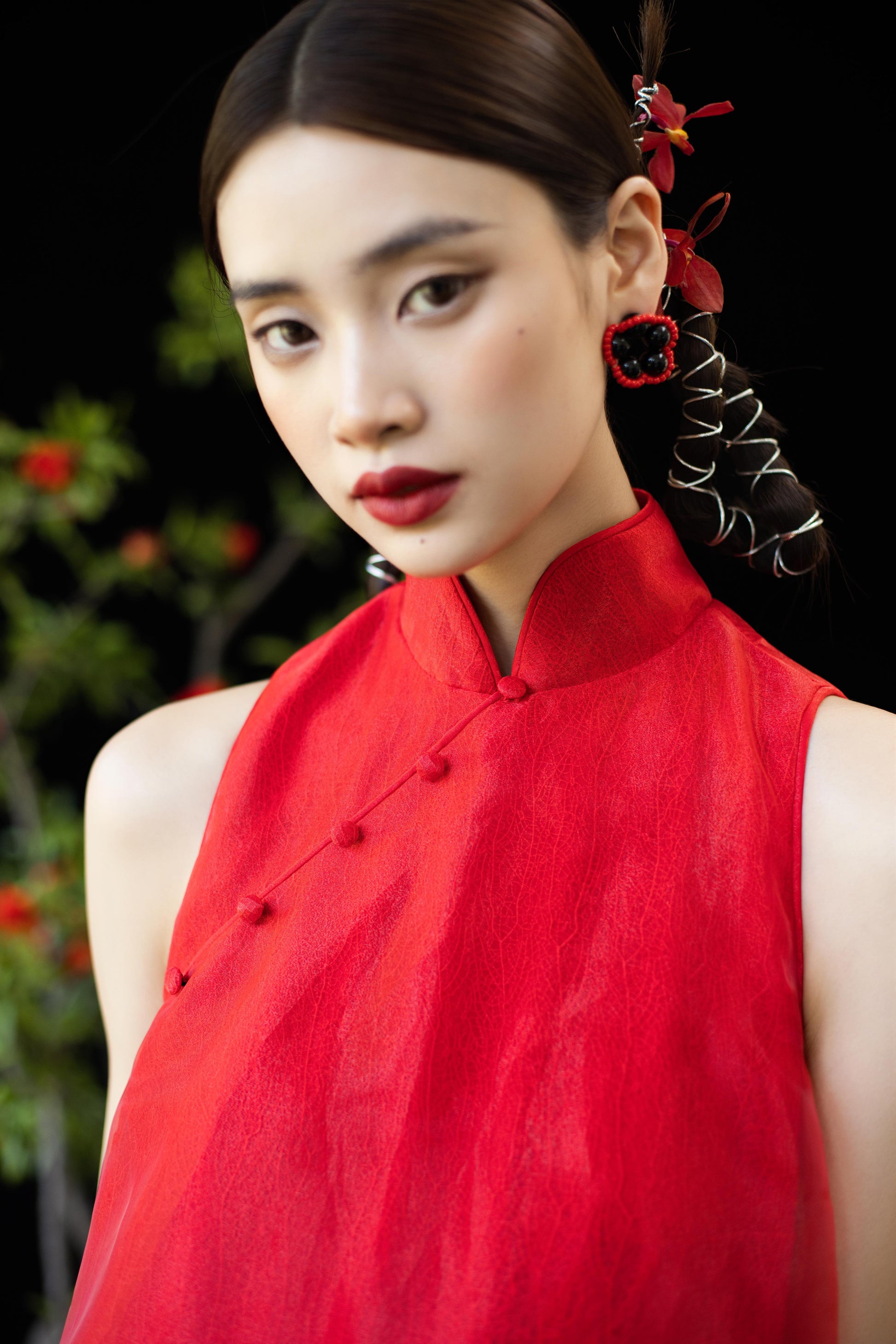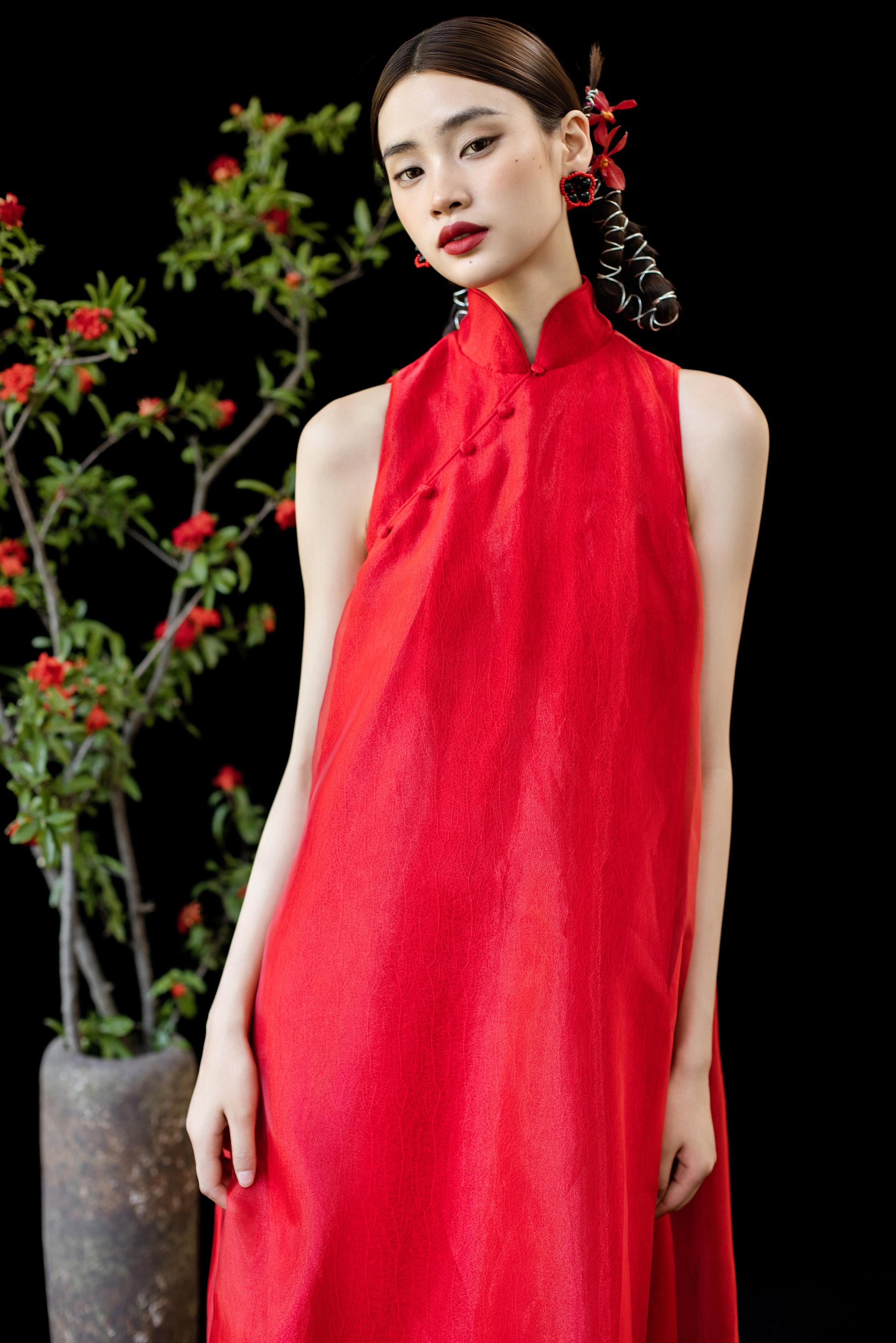 整体采用中式立领,搭配削肩设计,让线条更立体修长。