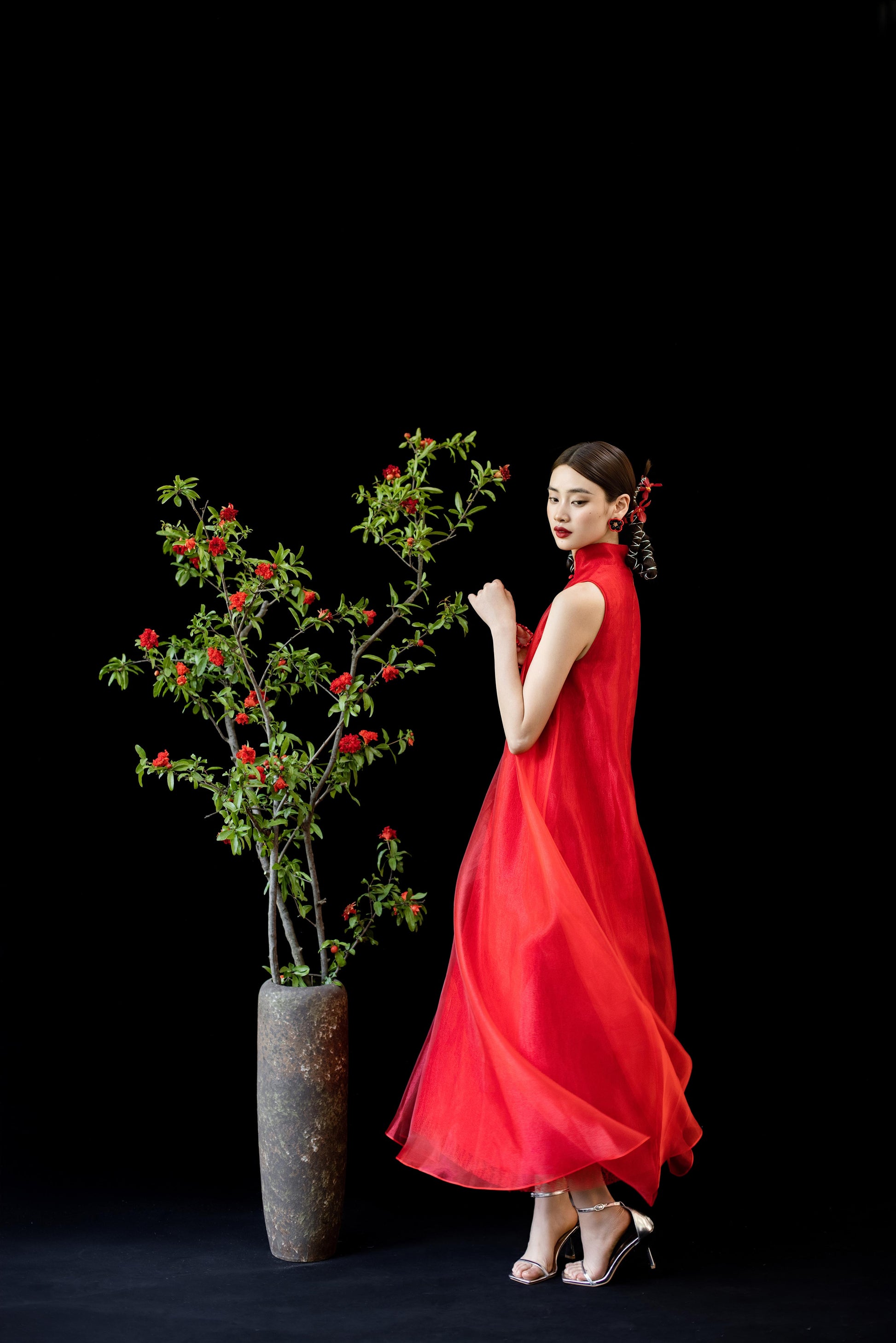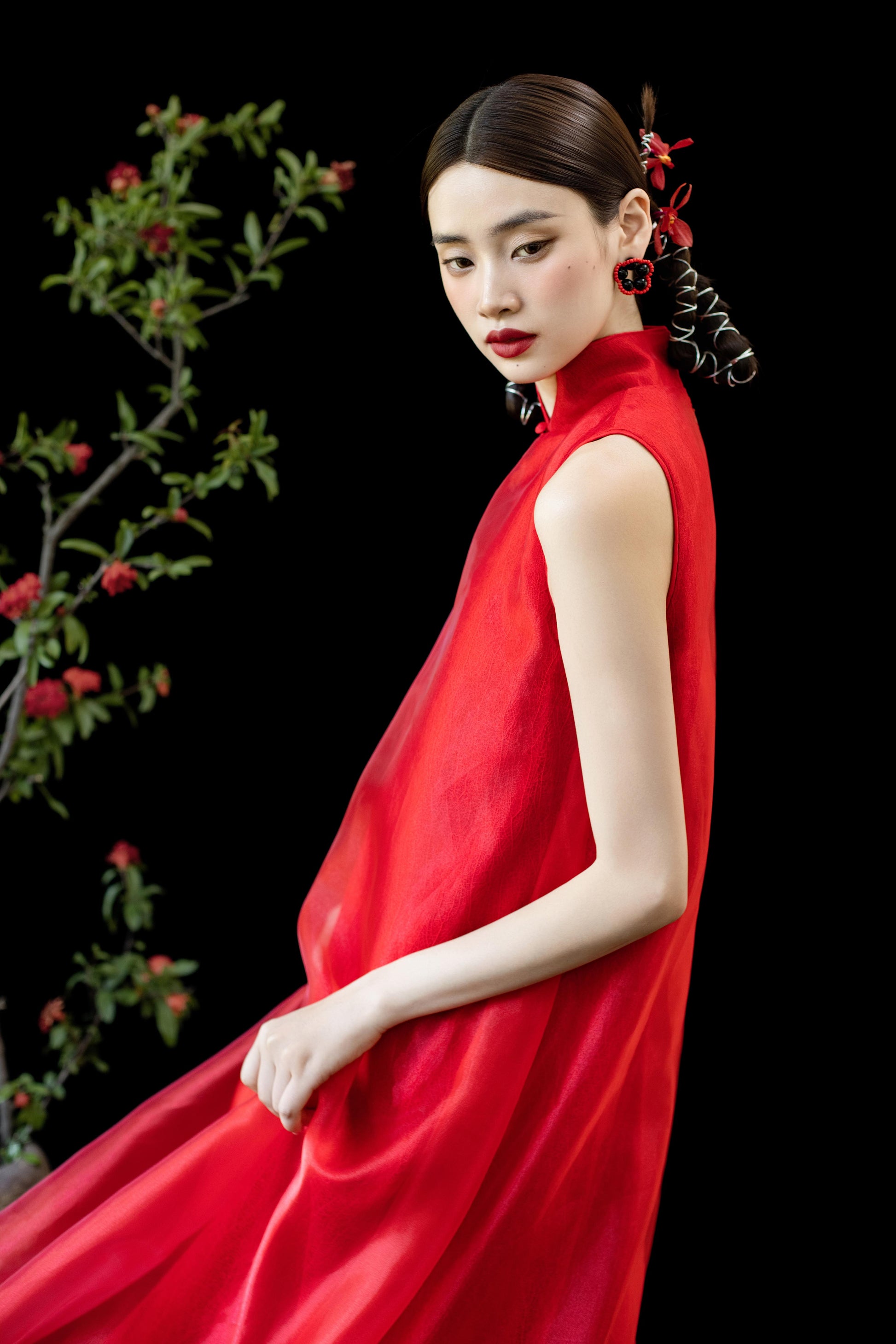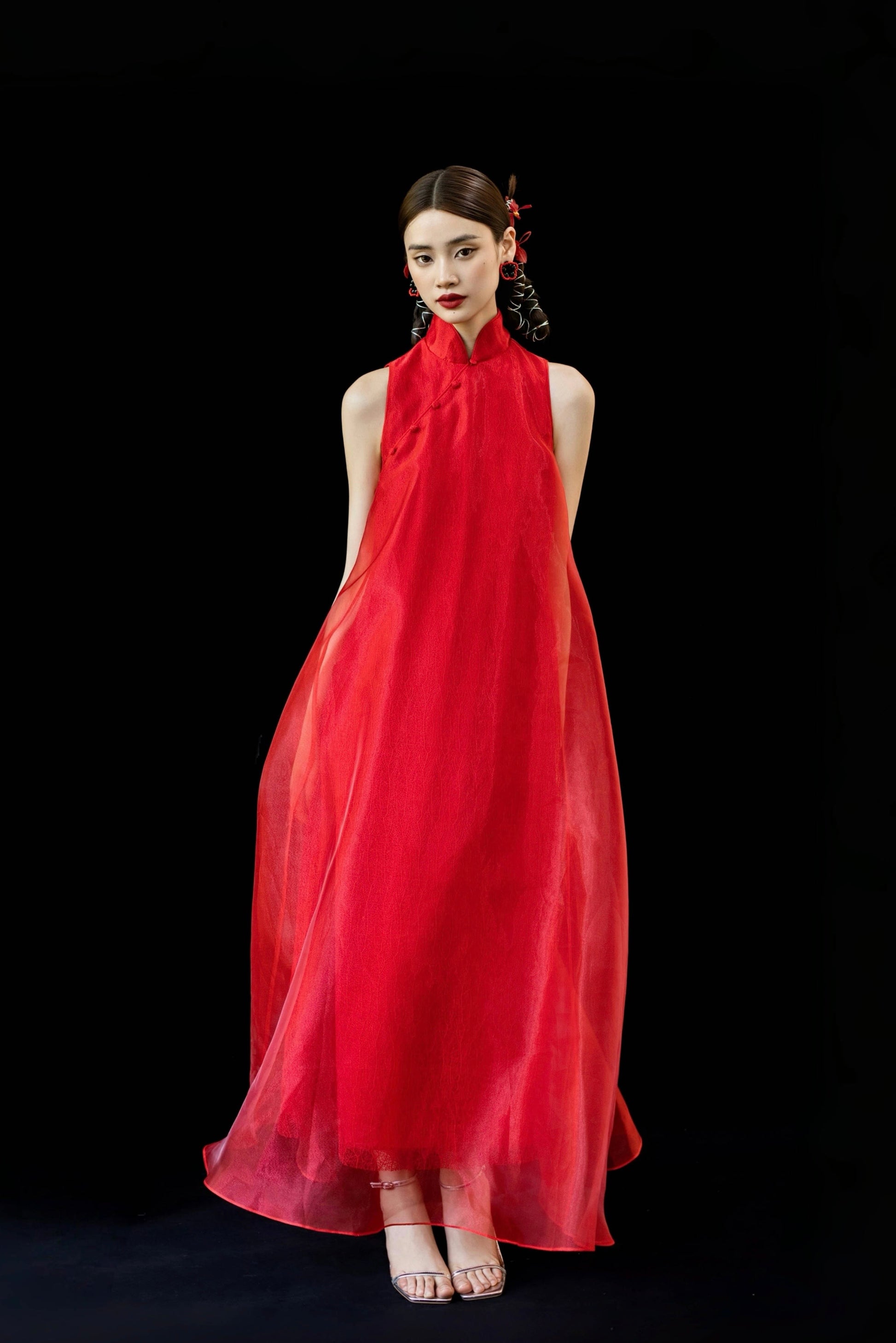 整体采用中式立领,搭配削肩设计,让线条更立体修长。