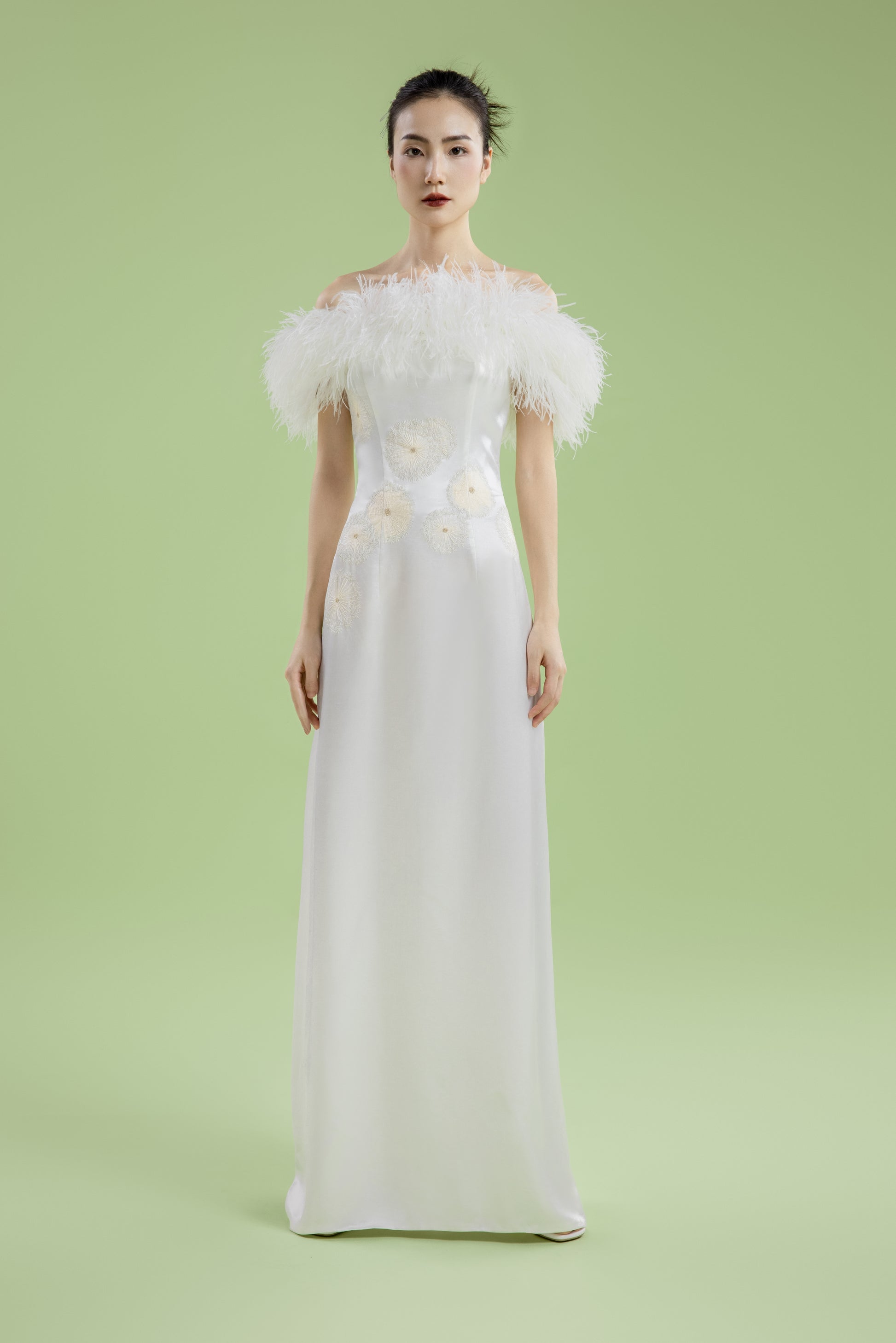 一字肩的驼鸟毛堆砌,体现蒲公英在空中飘散飞扬的状态。