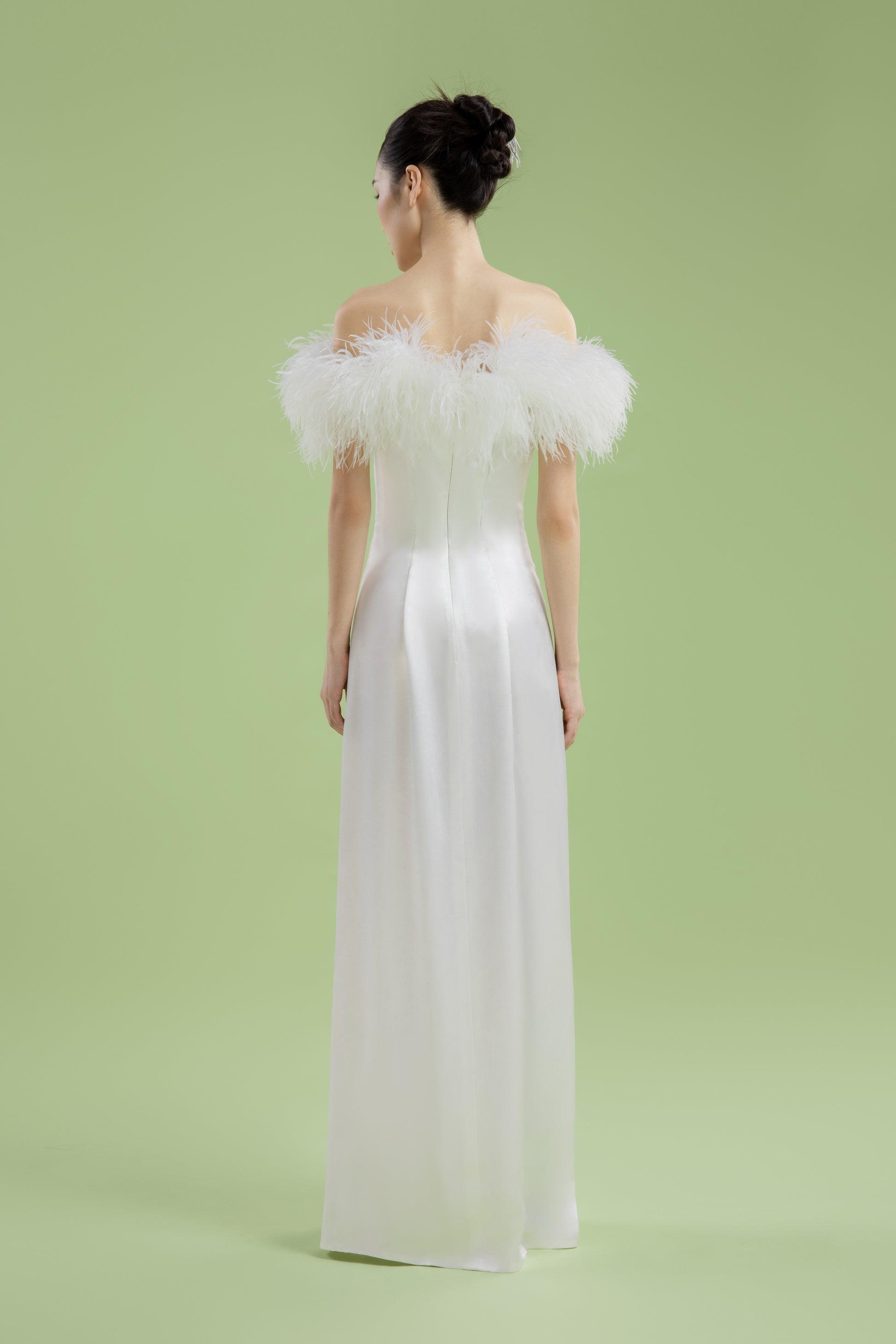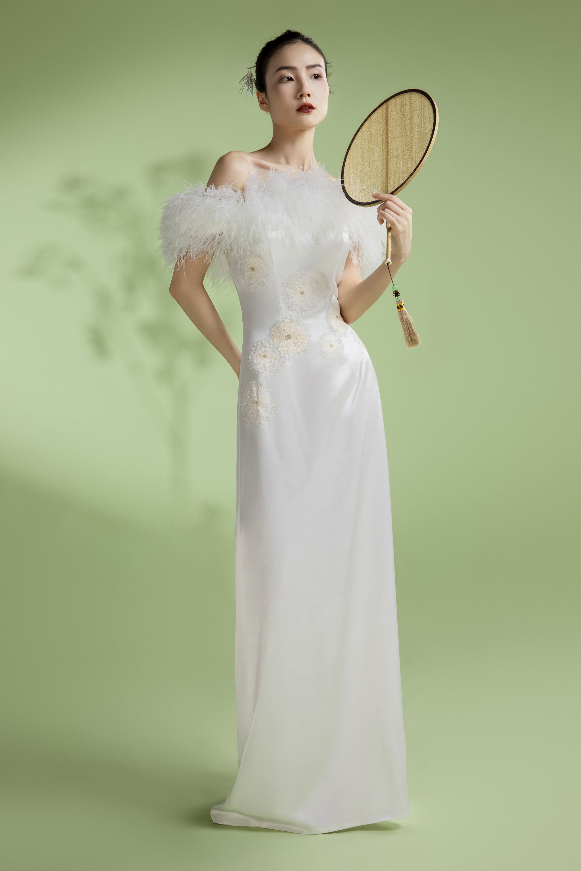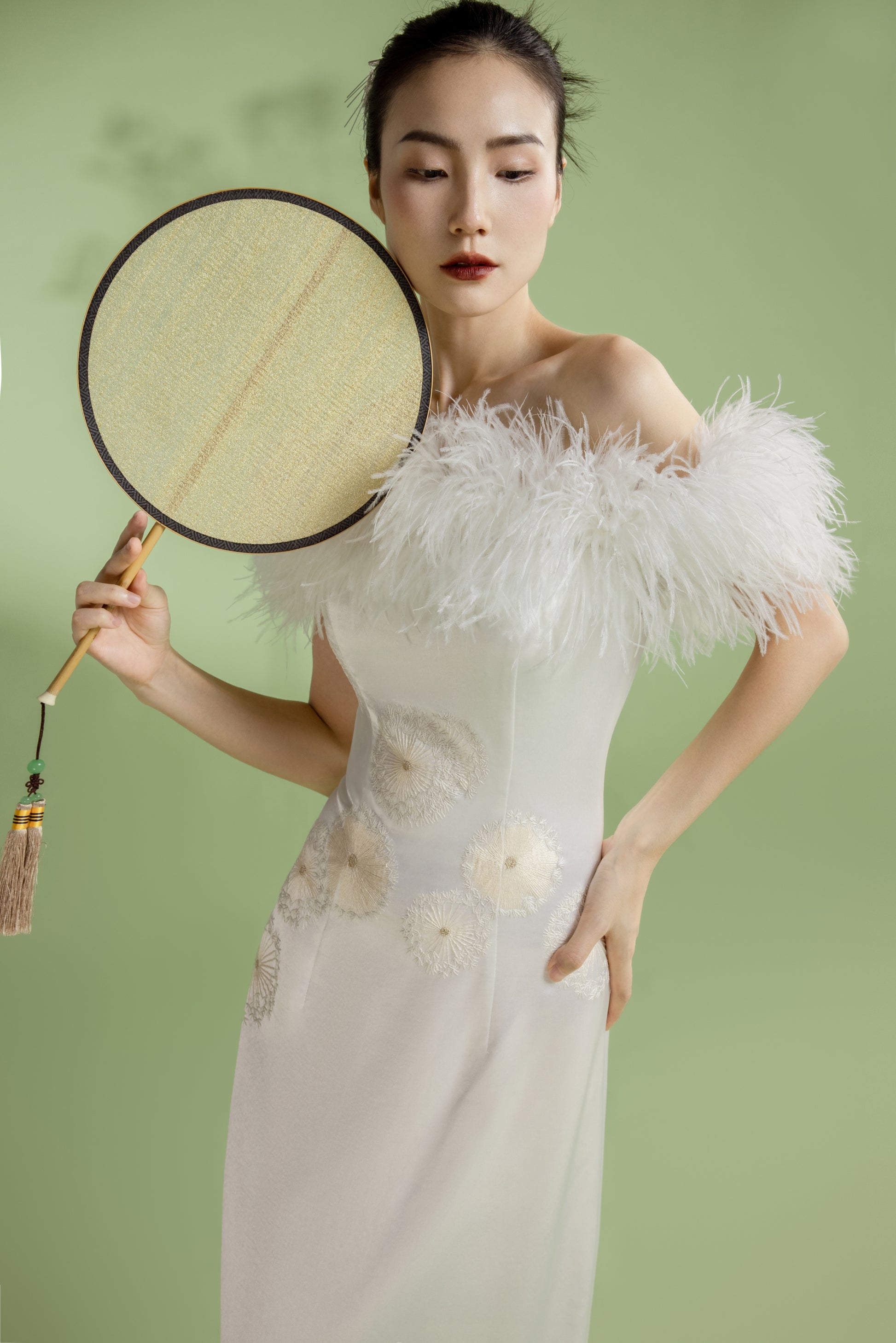 修身的版型配以一字肩的驼鸟毛,增添了一份民国时期的复古感,塑造出一种东方摩登风格。