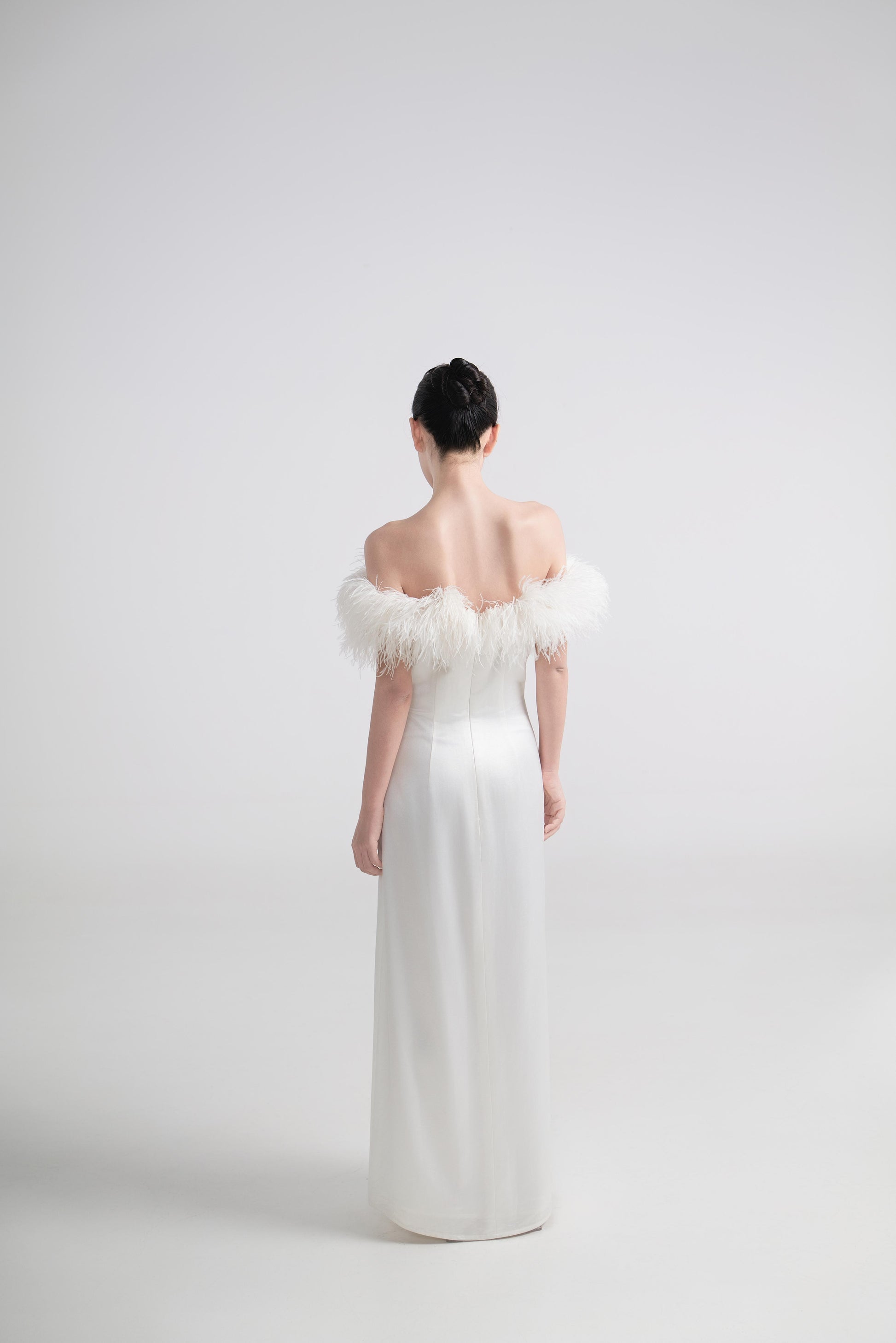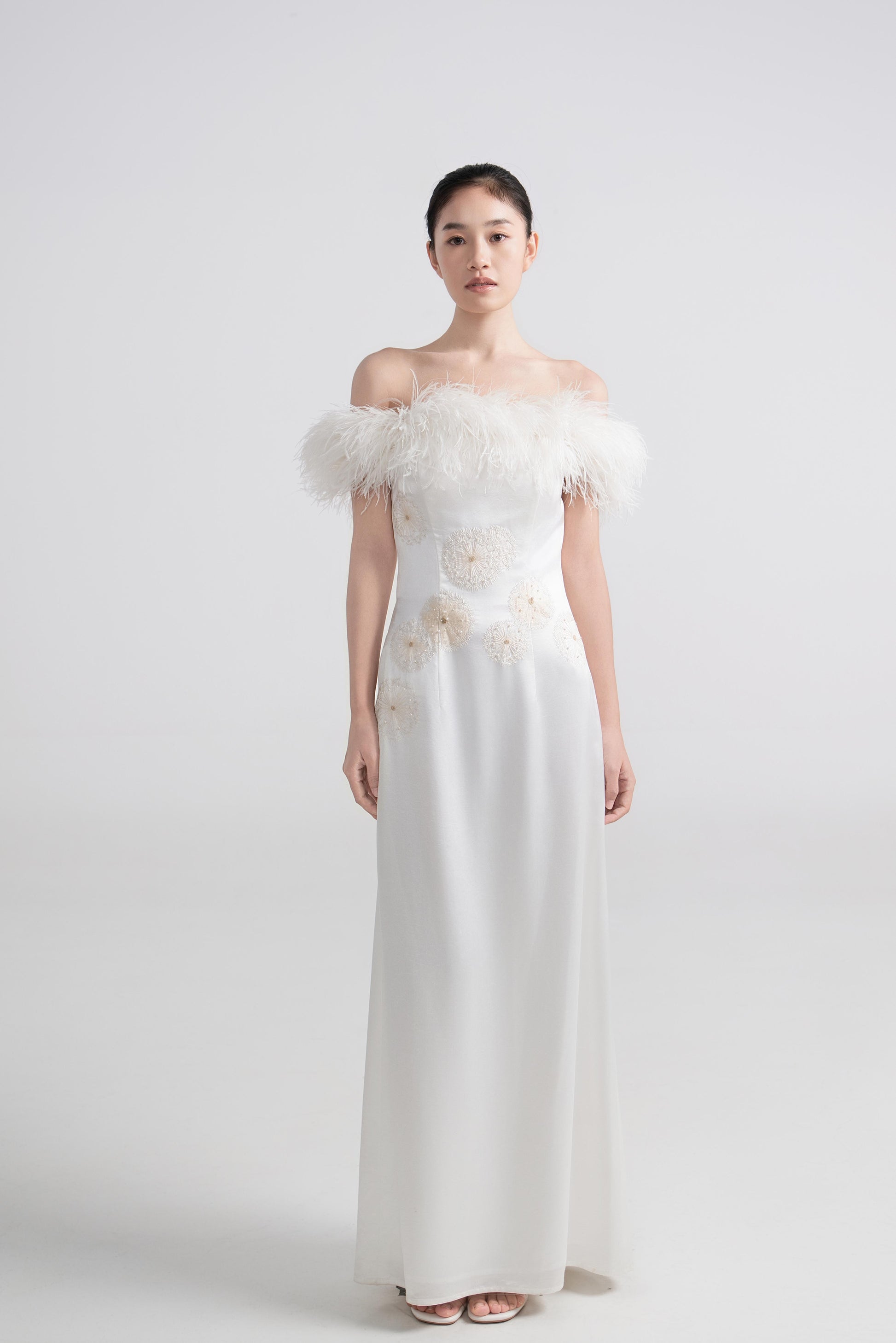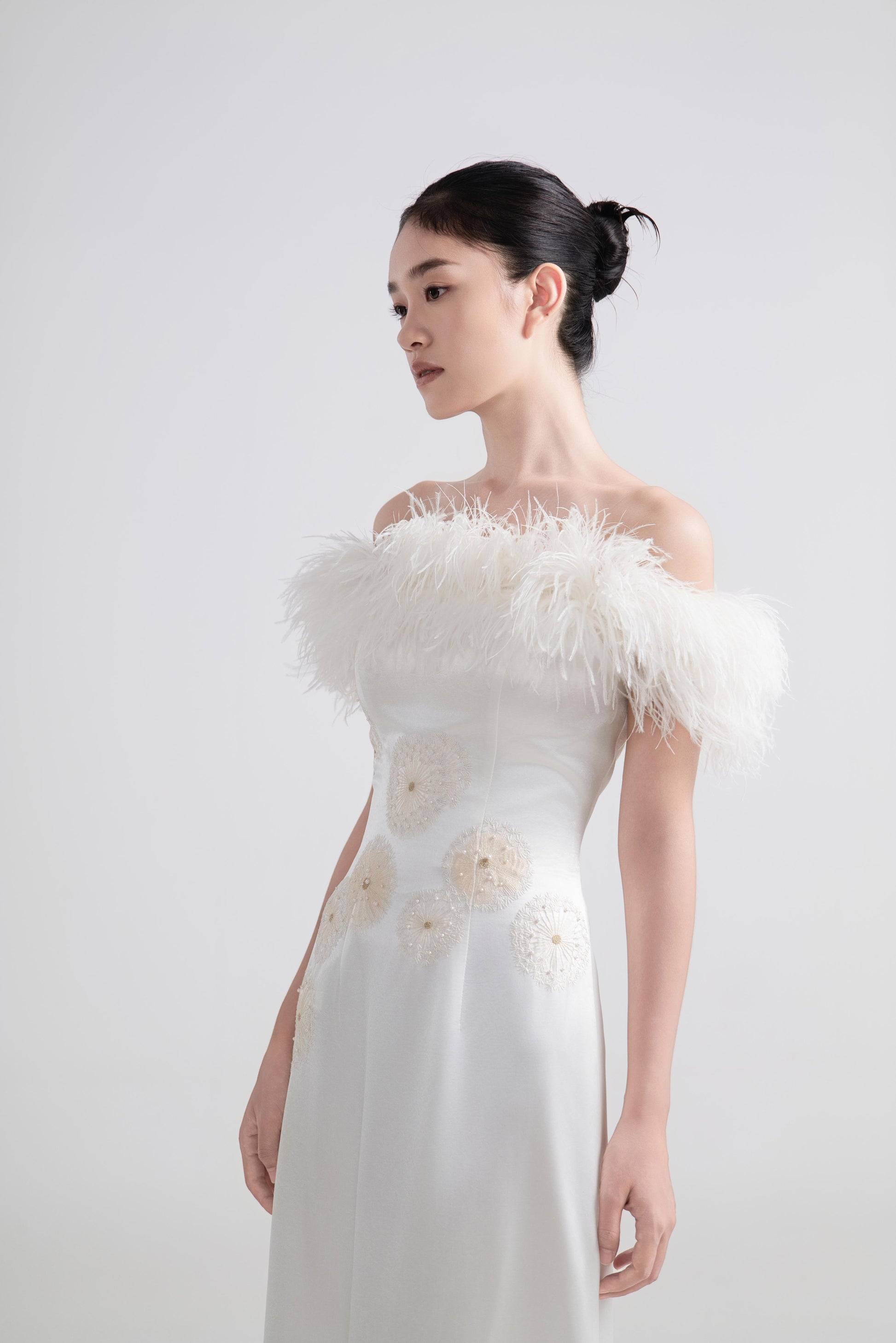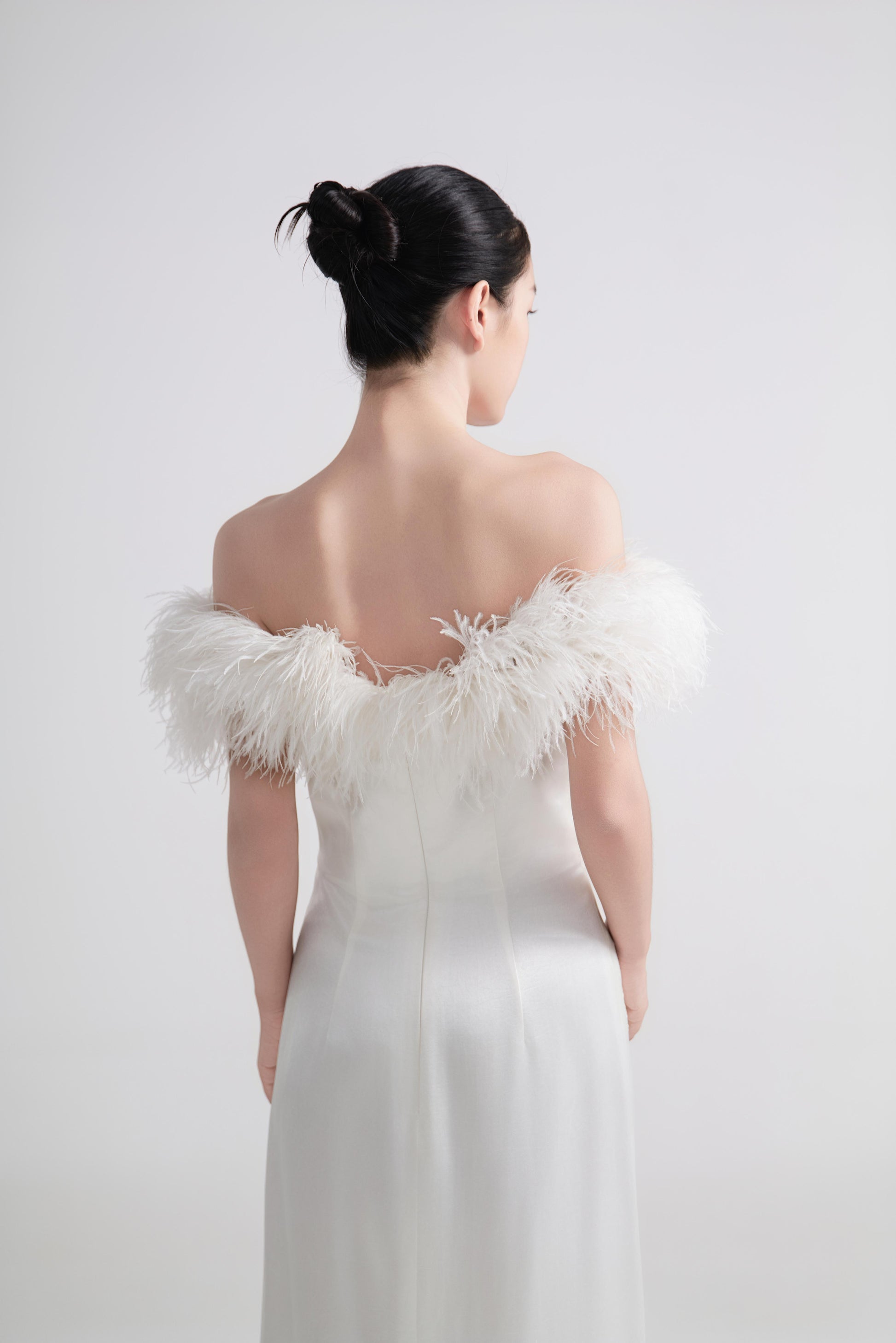 - 一字肩设计,搭配鸵鸟毛层叠堆砌,呈现蒲公英飞扬般的浪漫动感。