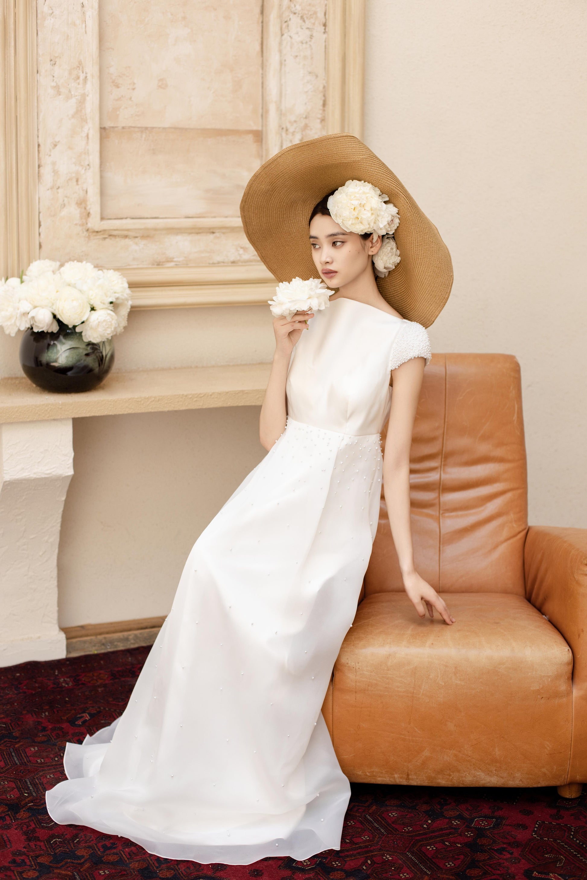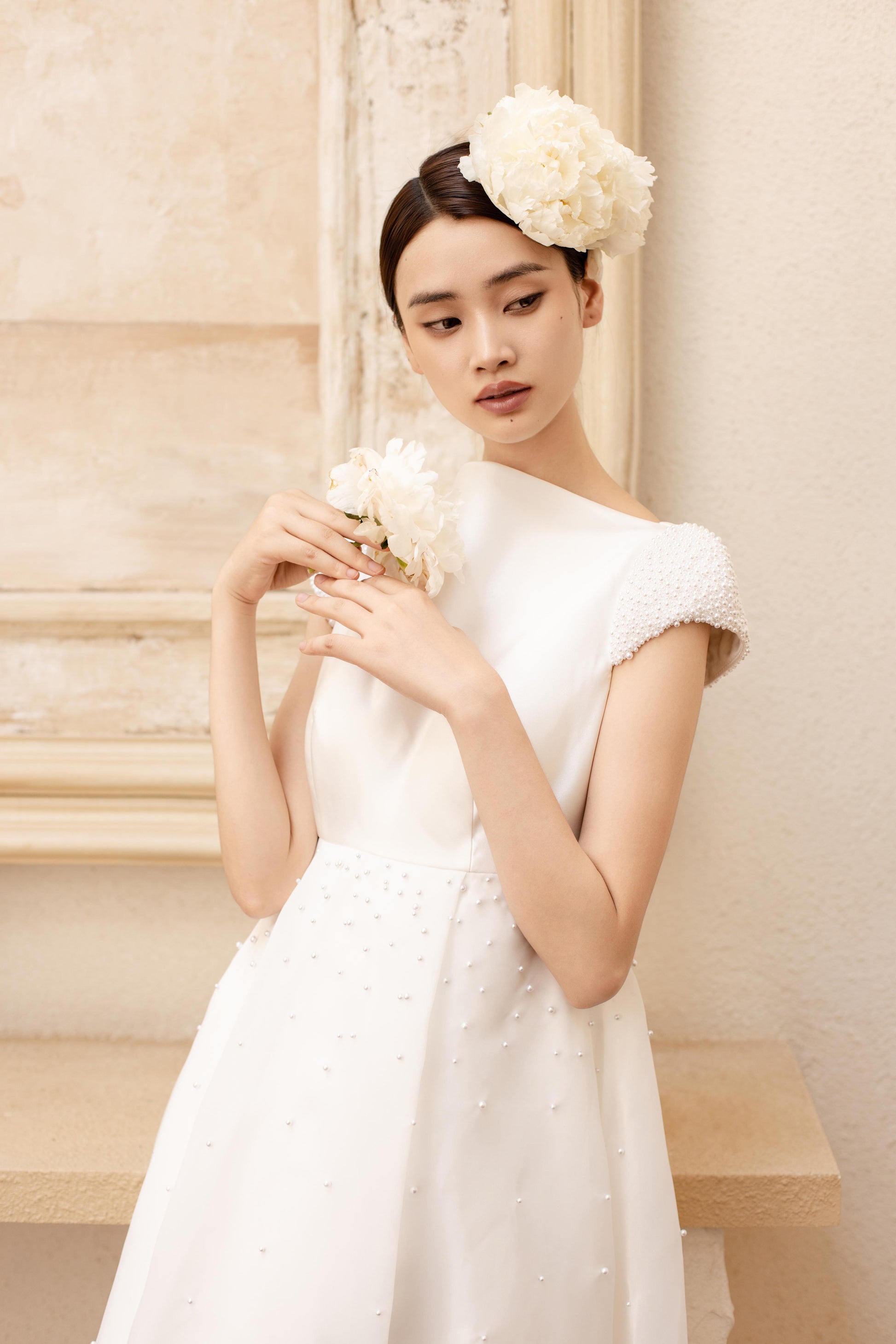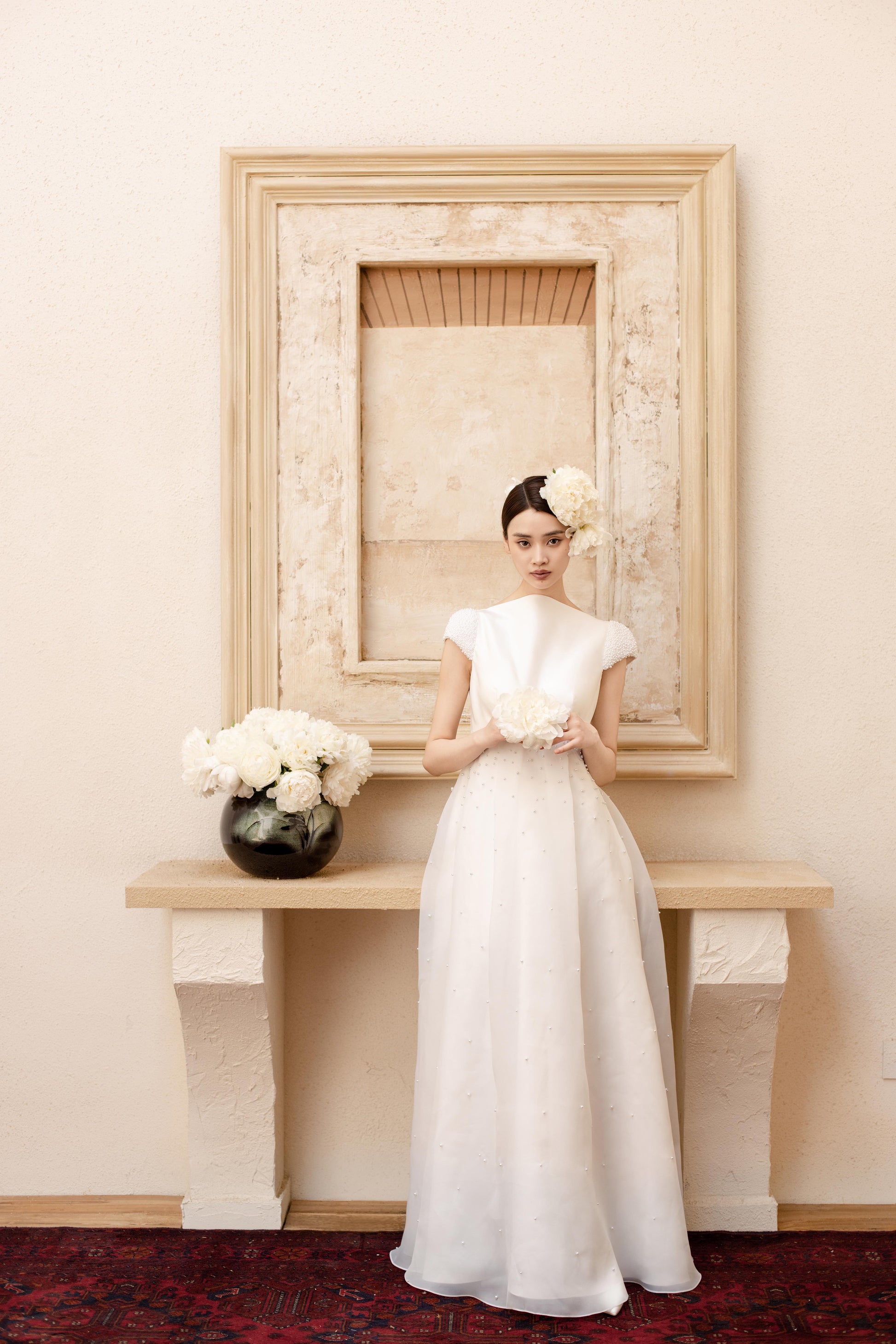 整袖顶满手缝珍珠,如云中点星,结构感与柔美并存。