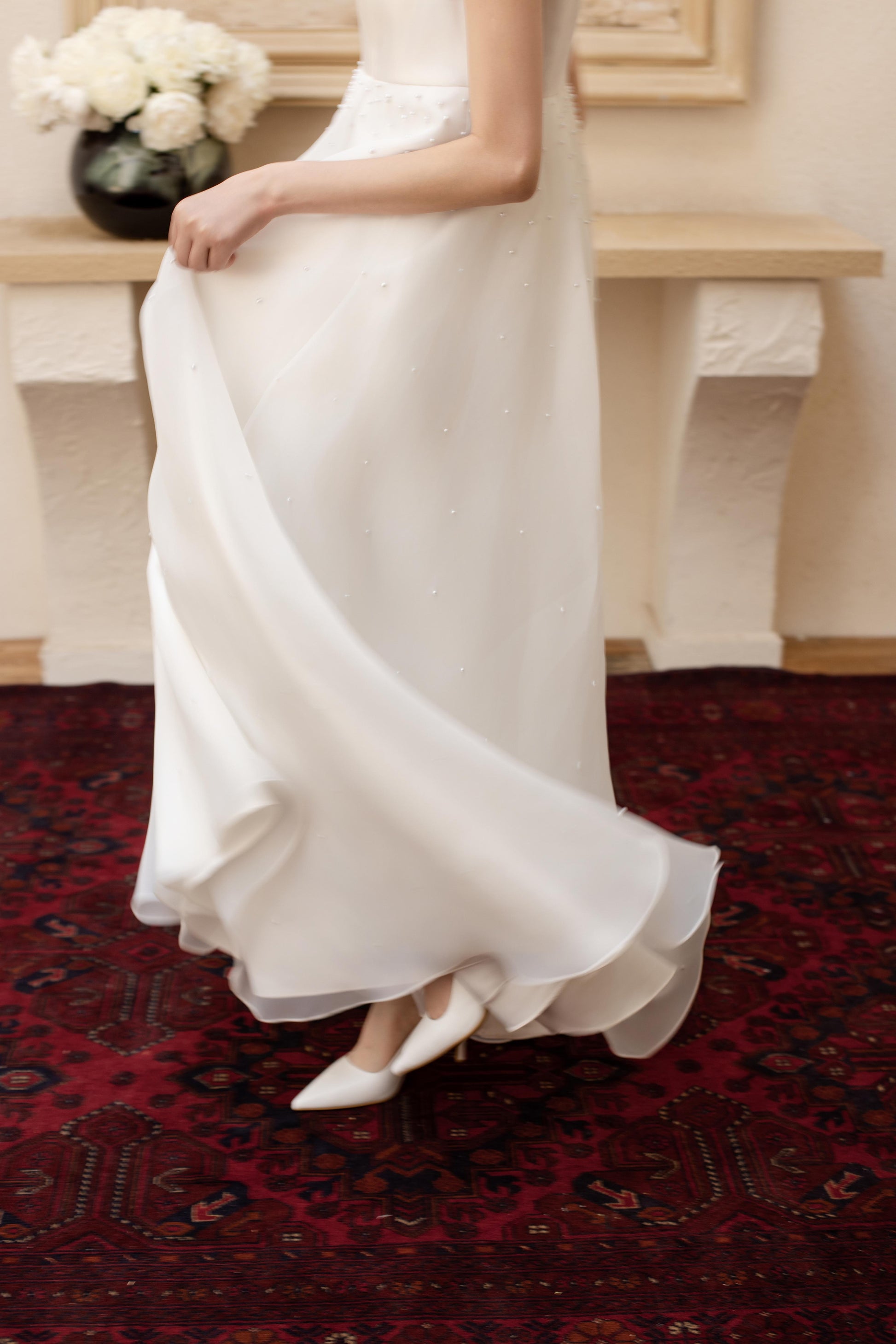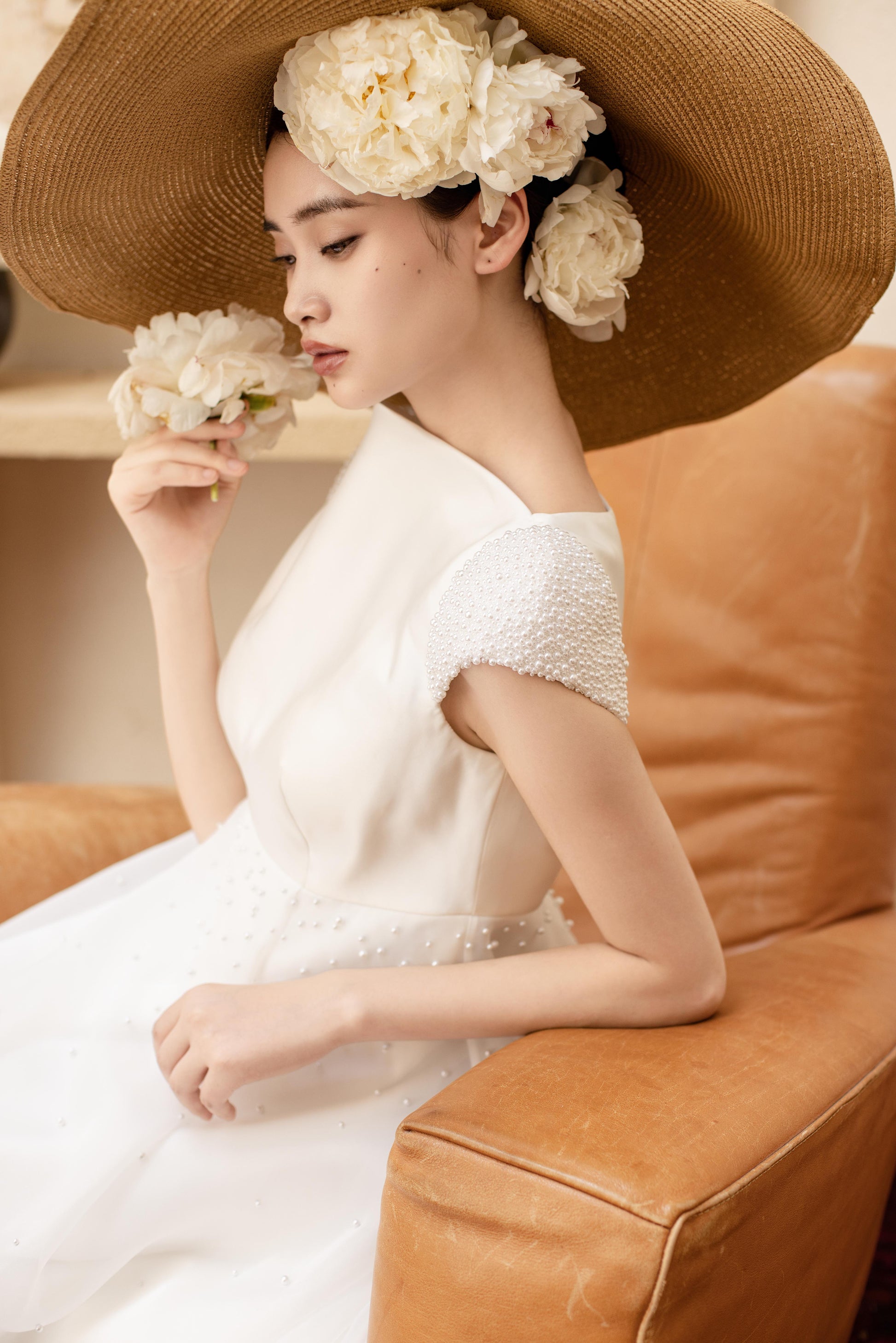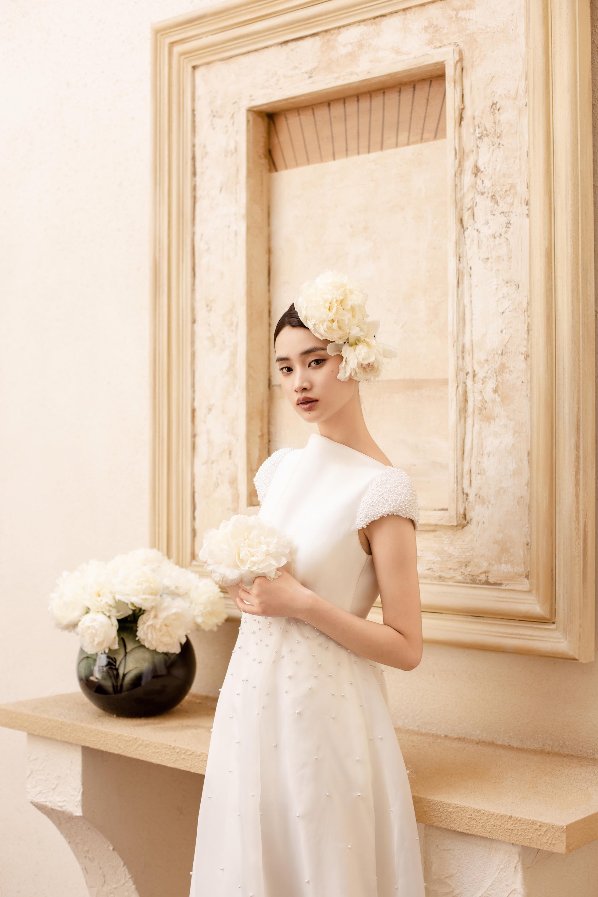 整袖顶满手缝珍珠,如云中点星,结构感与柔美并存。