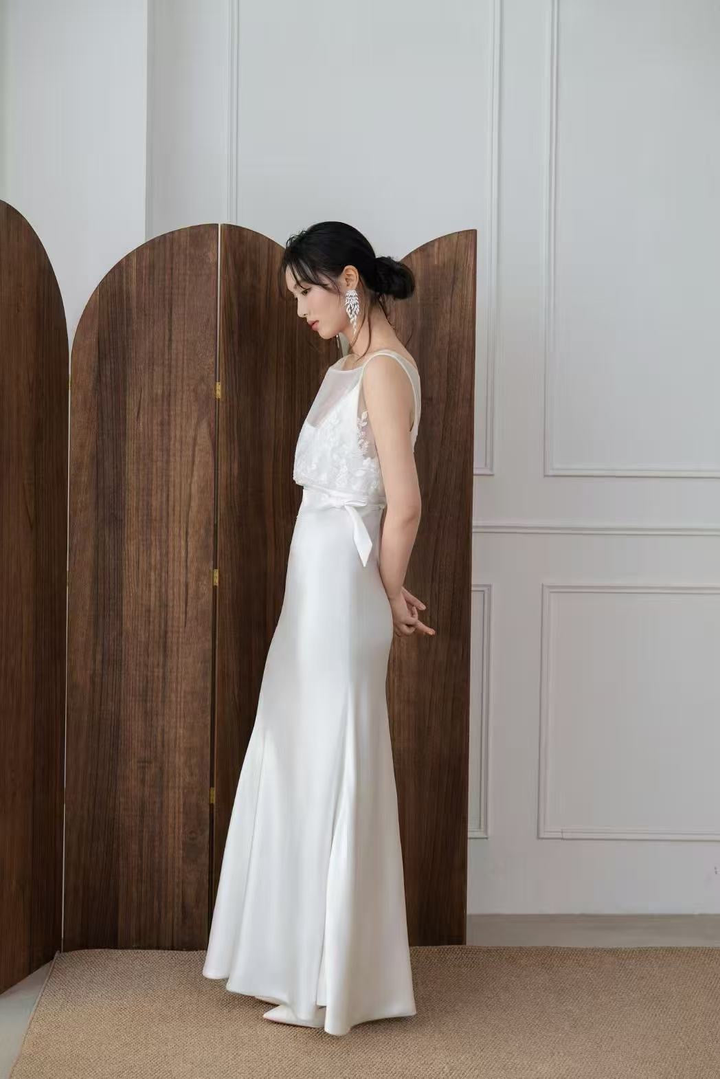 斜裁鱼尾吊带裙搭配蕾丝高腰背心,可叠搭也可单穿,线条流畅,穿着轻松。V 领设计自然修饰颈部与锁骨线条,斜裁鱼尾裙顺着身体曲线延展,比例利落而不刻意。醋酸缎面料自然垂坠,带有细微光泽,质感高级;钉珠蕾丝透亮细腻,为整体增添轻盈层次。