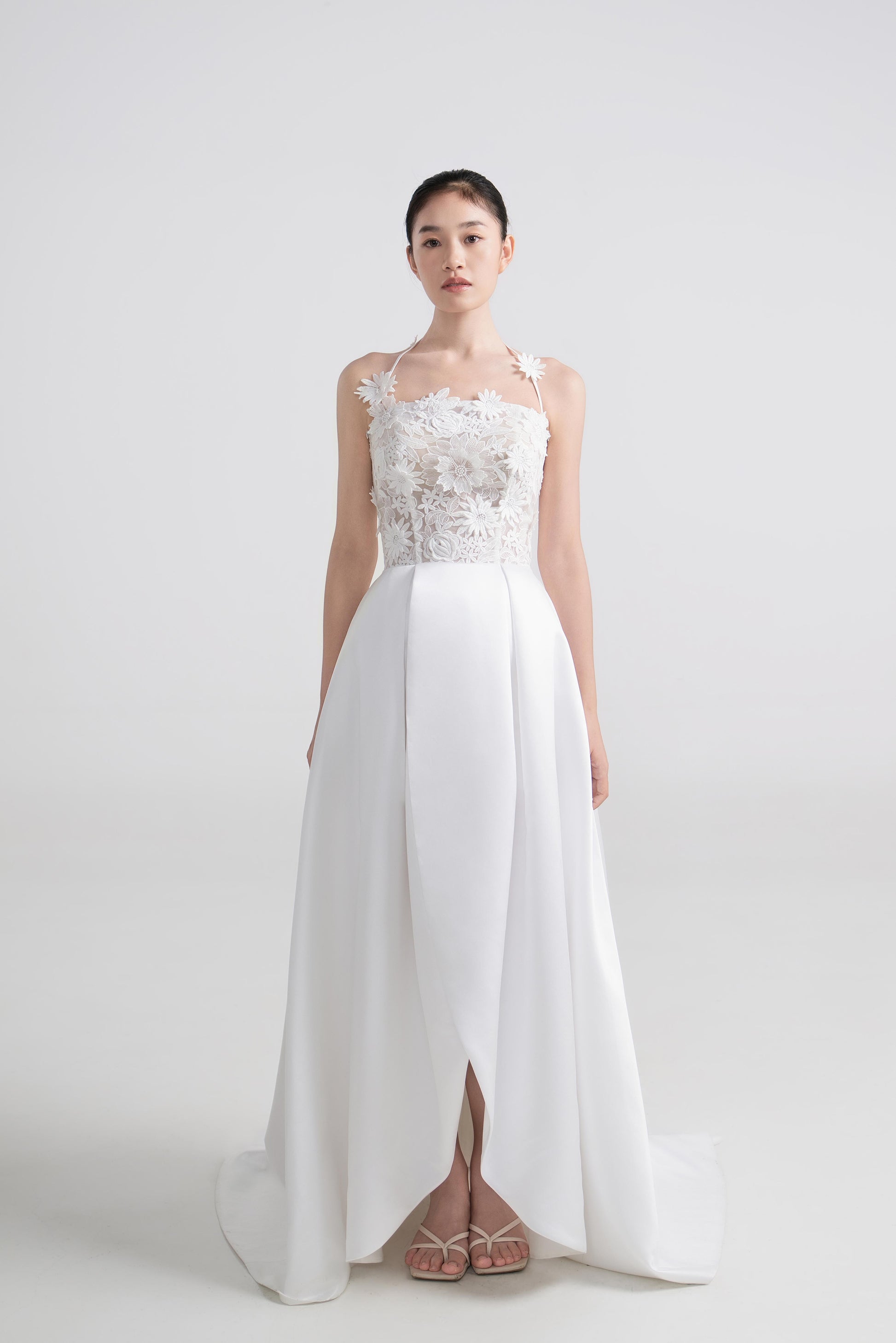 - 裙摆开衩,像待放的花朵。