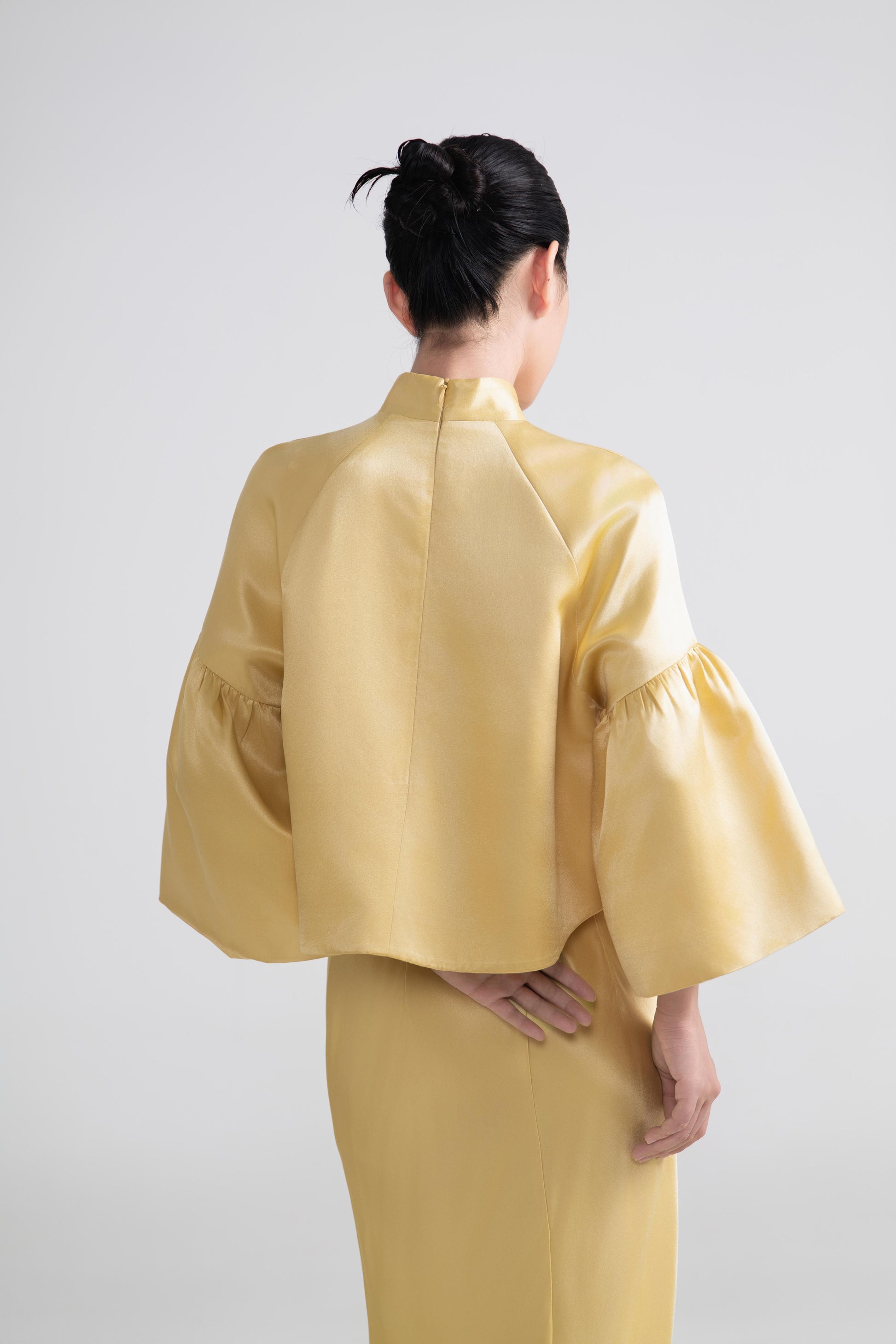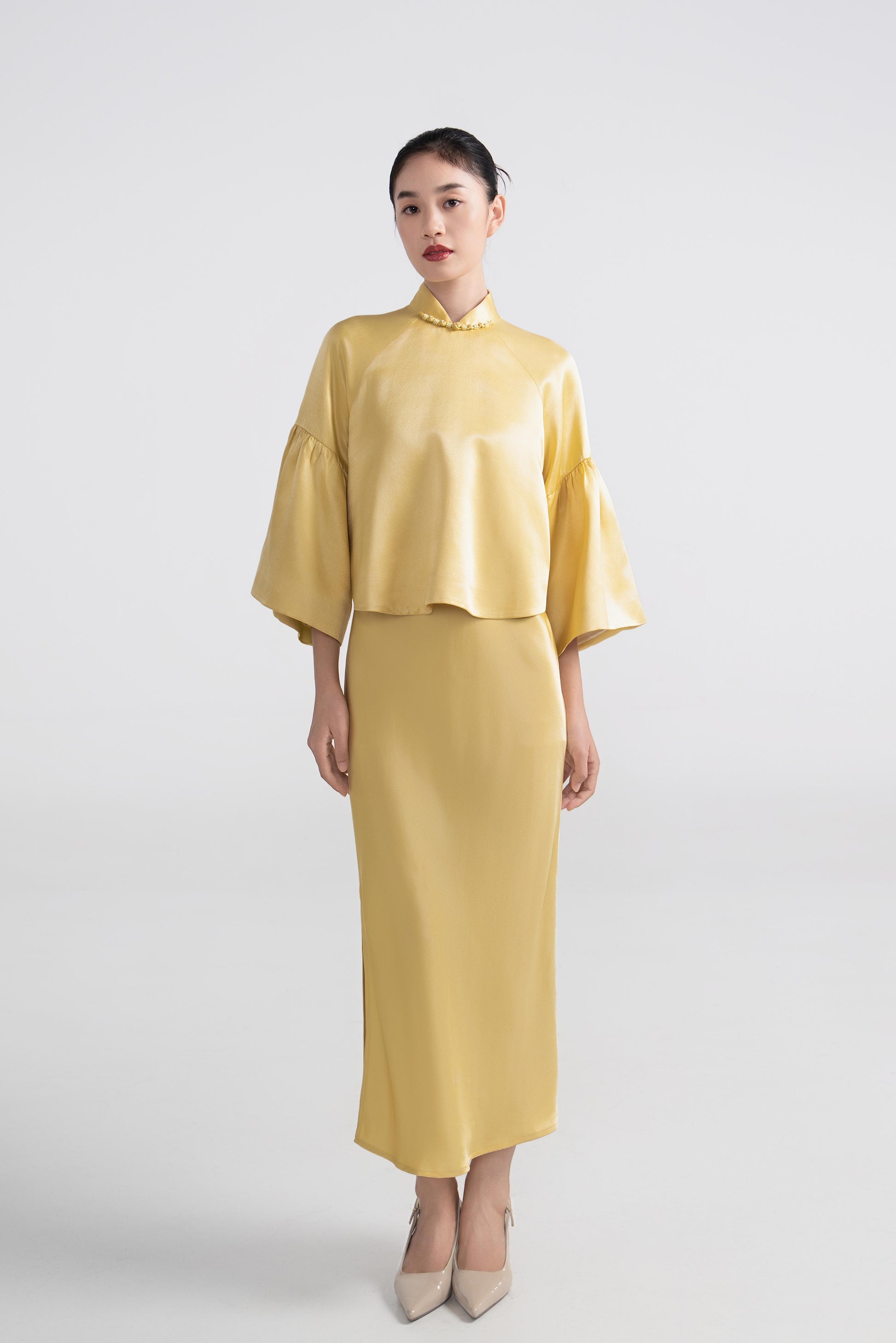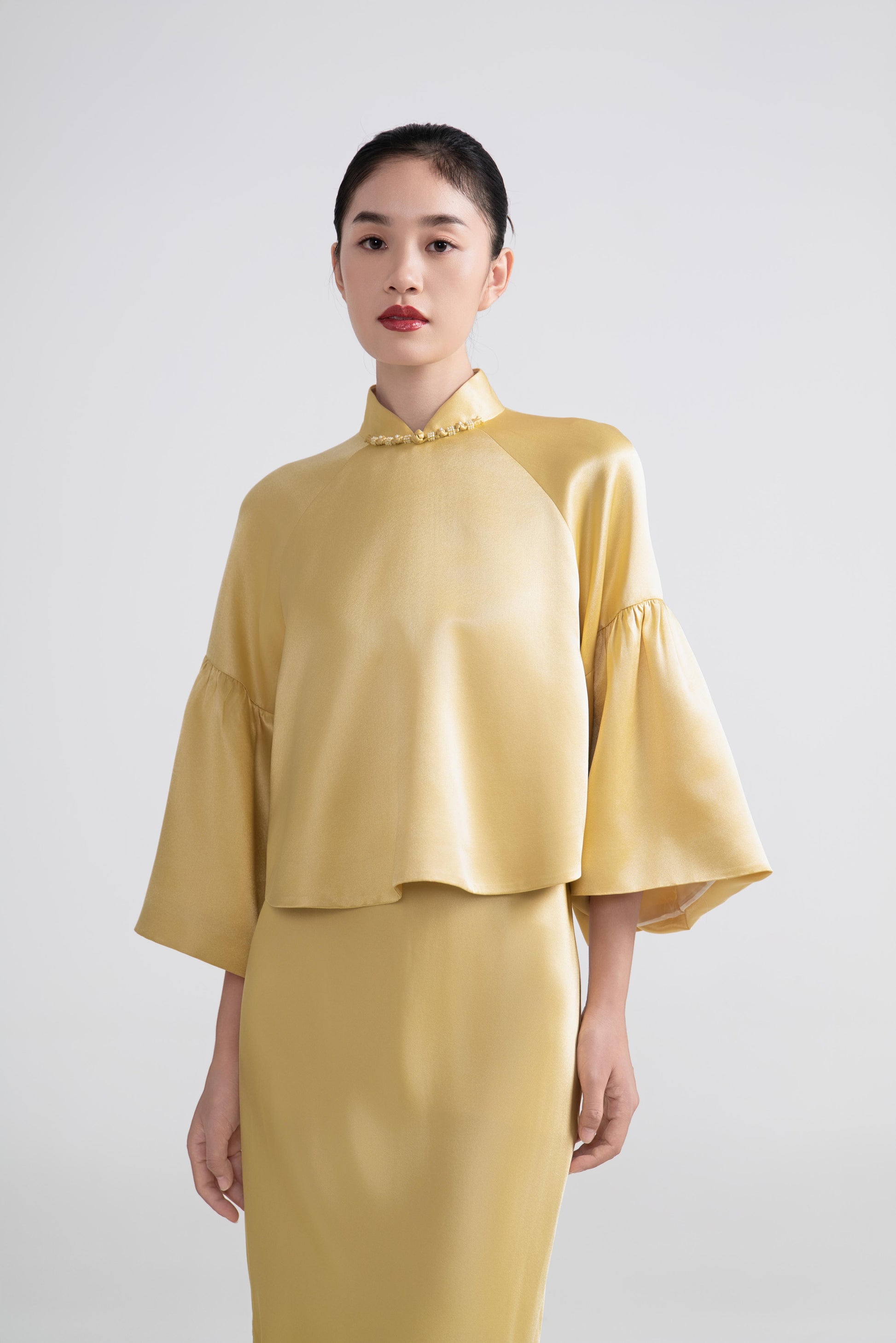 整套采用两件套结构,上衣为中式立领,高腰插肩设计,自然勾勒出肩颈和腰线,