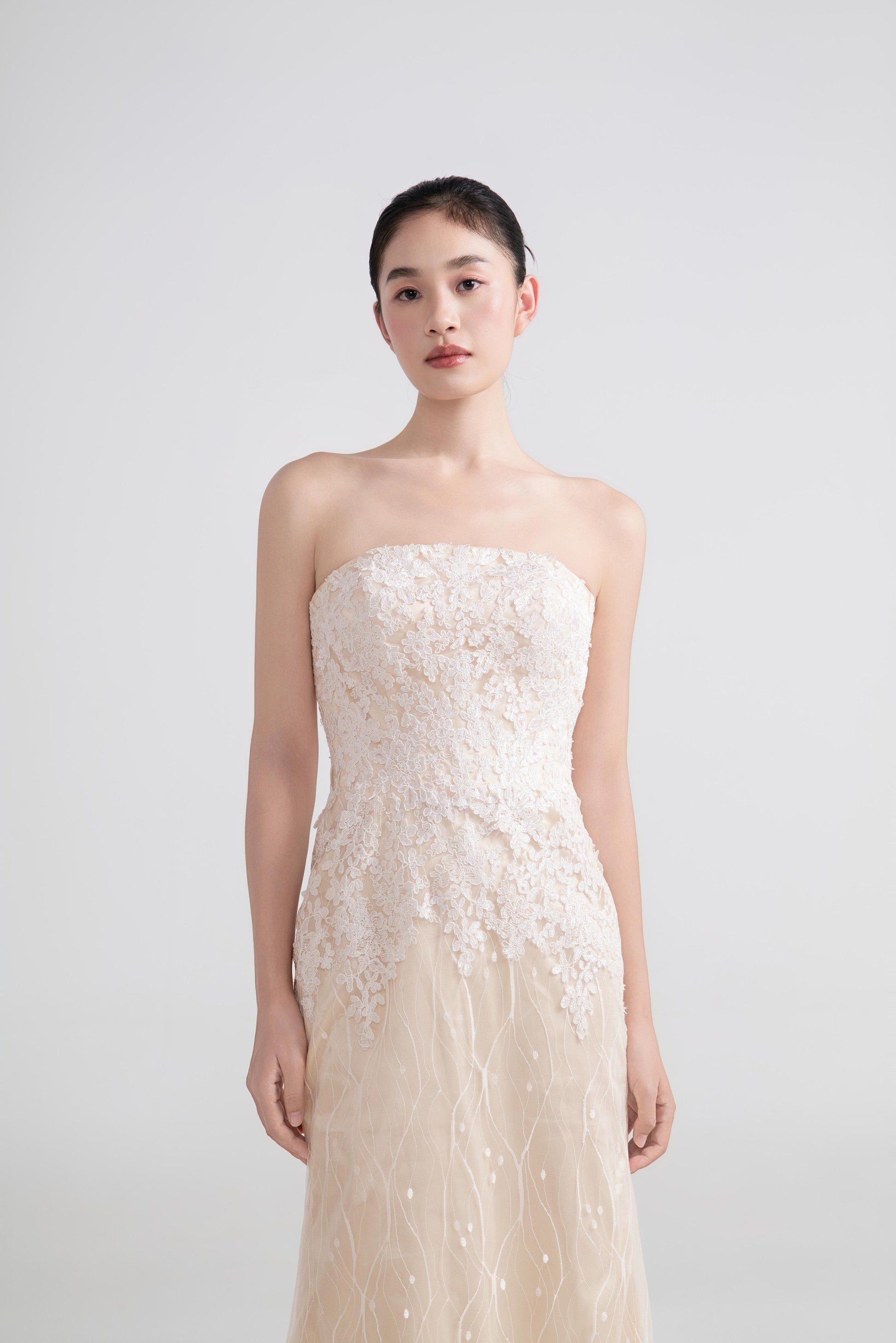- 抹胸领口设计,内敛自然,修饰肩颈线条。
